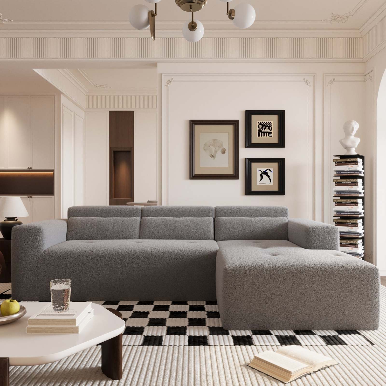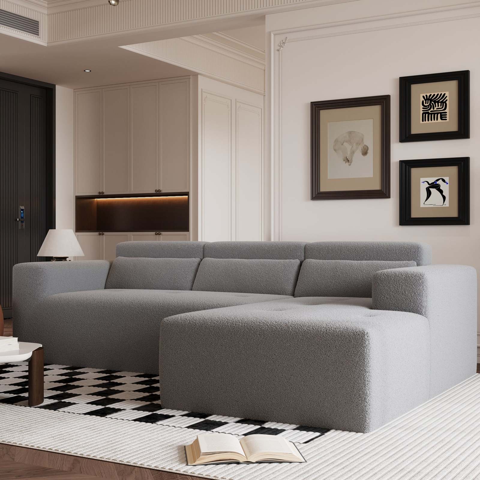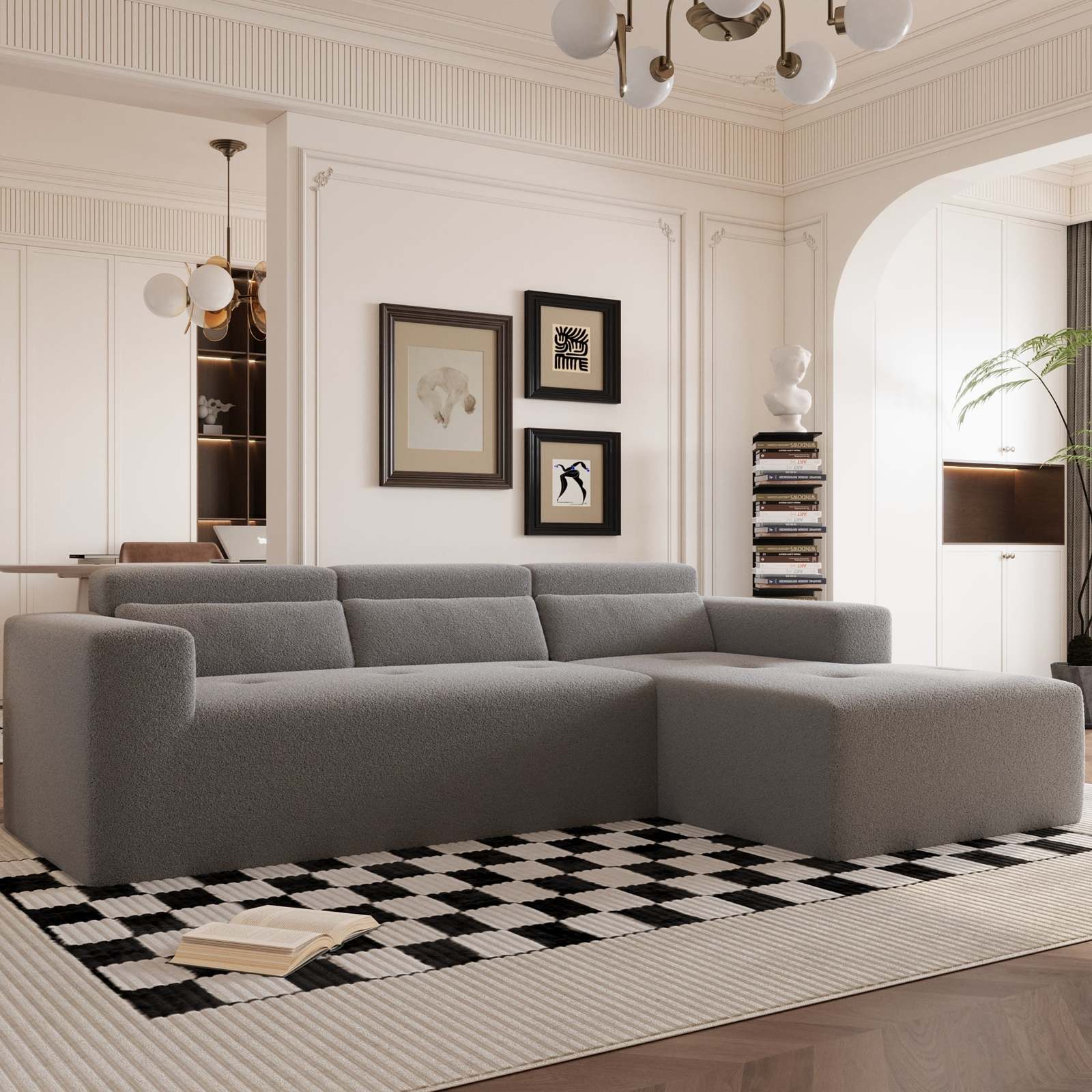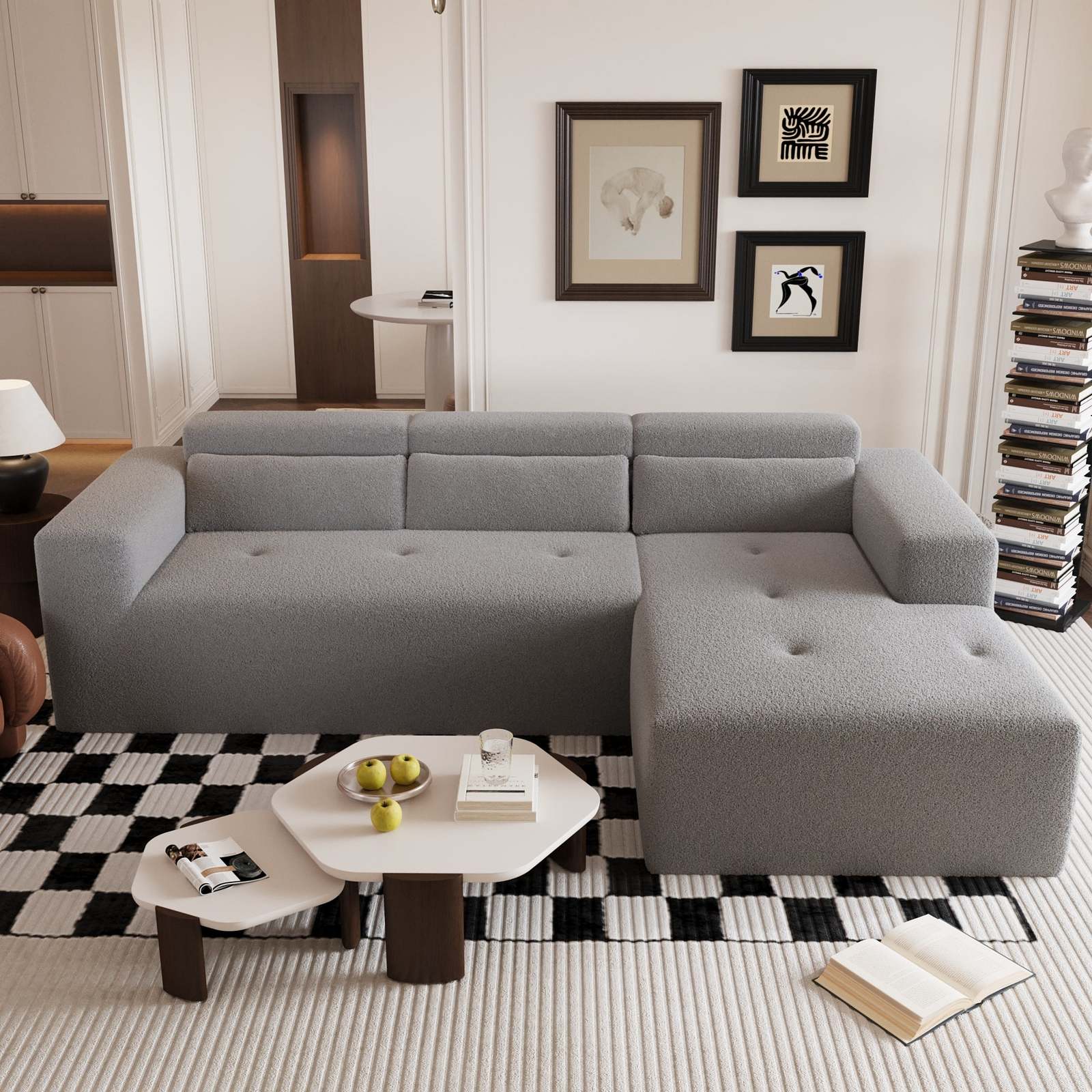 2.This sectional sofa is made of soft, breathable Teddy fabric and is crafted entirely from high-density foam and headrest for back support. The extra-wide seat provides plenty of lounging space and delivers cloud-like comfort.