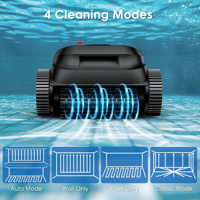 Effortless Onboard Control: No complicated operation required! Choose the mode according to your needs (floor/wall/automatic), just press the button and put pool cleaner vacuum in the water and it will start working immediately