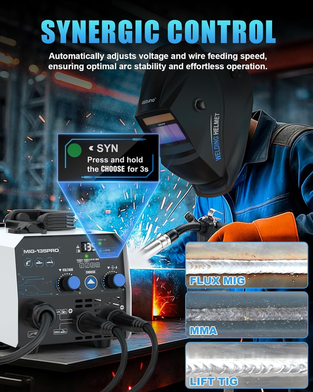 ?SYN CONTROL EASY TO OPERATE?: With SYN control, this welder automatically adjusts the current and voltage based on the selected wire diameter, ensuring optimal settings. Its user-friendly design and smooth wire feeding make it easy for beginners and professionals alike to operate effectively.