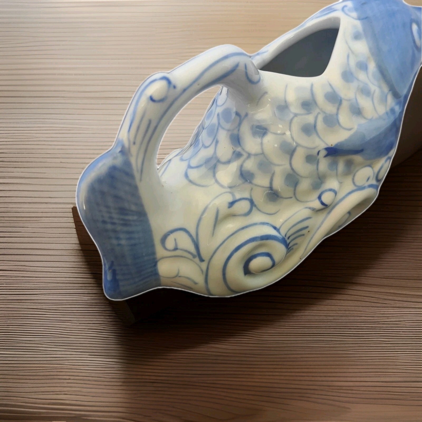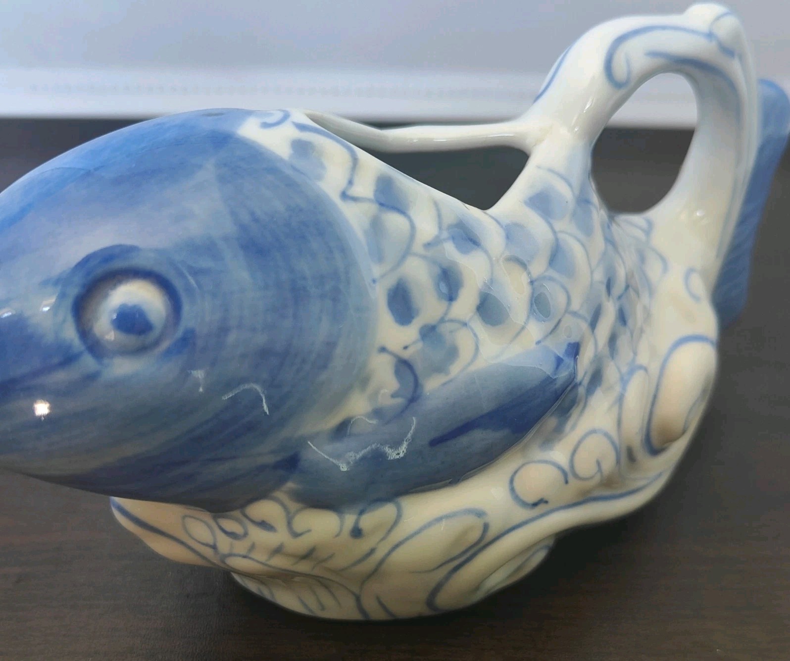 Antique Porcelain Chinese Koi Carp Fish Tea Pot Creamer 4” T 8” L Waves Decor