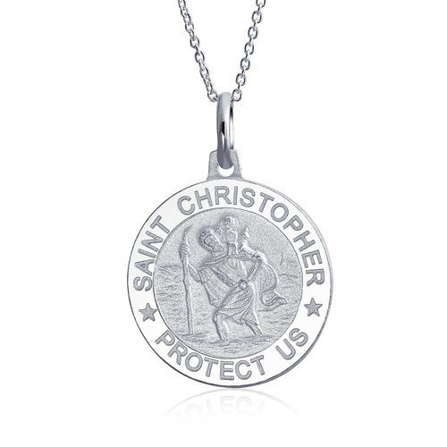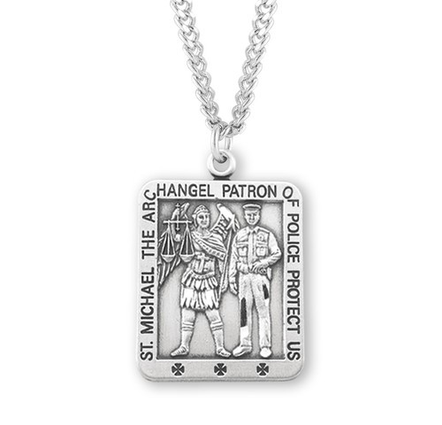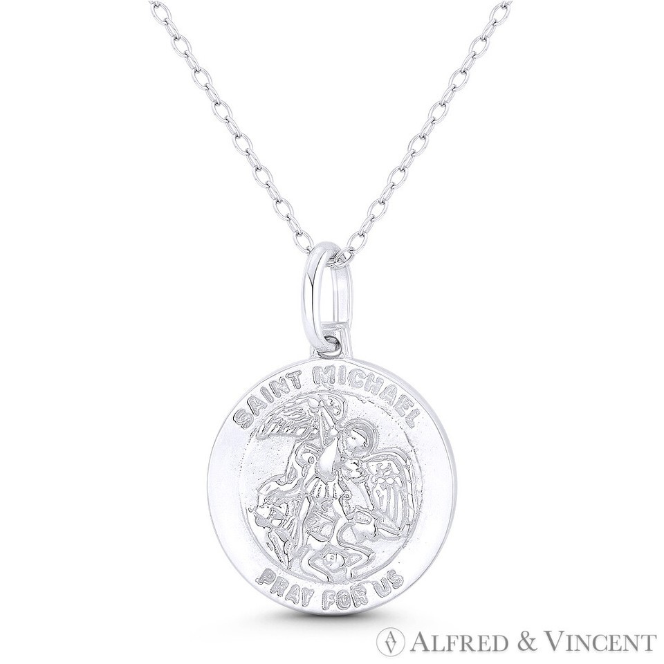 The featured pendant is cast in .925 sterling silver and showcases an 18mm (0.7in) round medallion detailed with an image of St. Michael, the Archangel surrounded by engraved text. The medallion is then finished with a sturdy bail that can accommodate most average-sized chains.