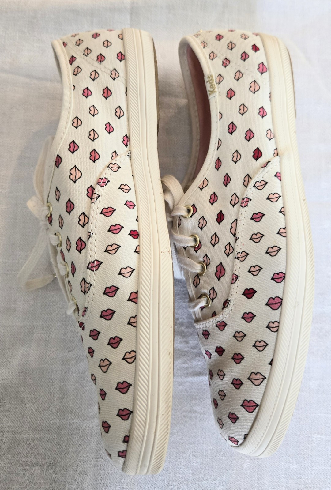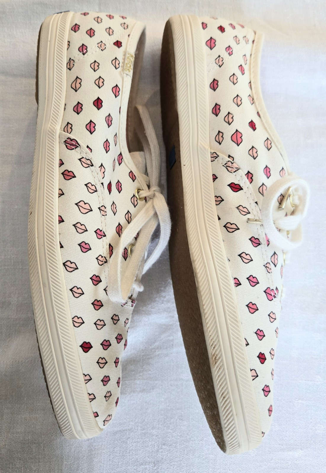 Beautiful Keds Champions kate spade New York "LIPS KISS" Lace up Sneakers. White with Shades of Pink Lips. Used one time in Boutique Store outdoor Fashion Show. Original Box is missing. Great gift idea!