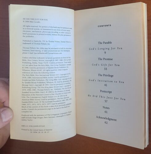 This inspirational book, He Did This Just for You, written by Max Lucado, is a perfect addition to your collection. Published by Thomas Nelson Incorporated in 2005, this paperback book measures 7 inches in length, 4.2 inches in width, and 0.2 inches in height. With 64 pages and written in English, it falls under the genre of religion and spirituality, covering topics like Christian theology, soteriology, Christology, inspiration, and spiritual growth.