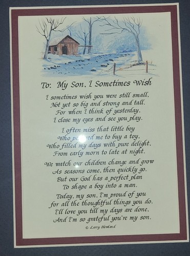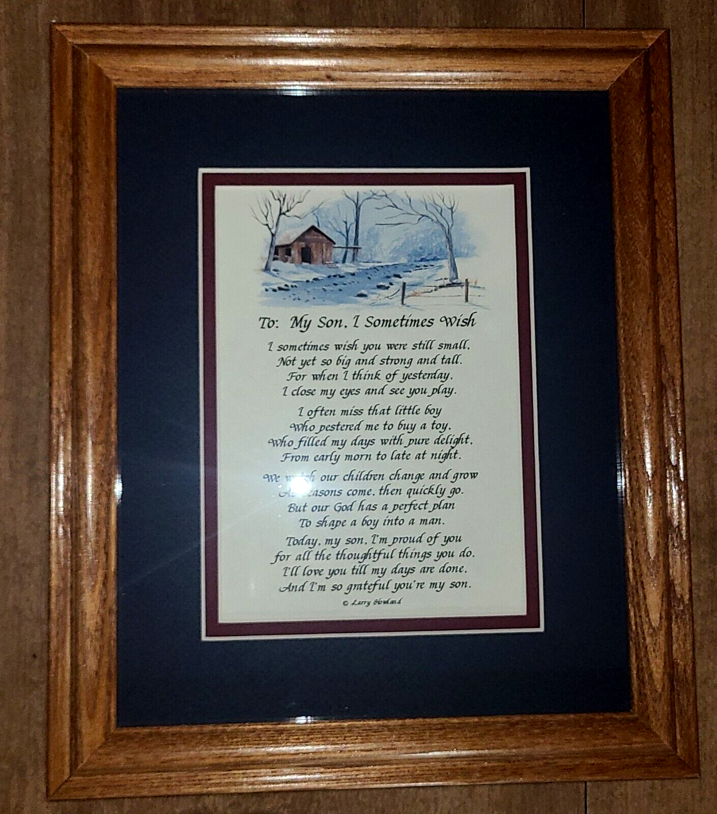 This beautiful print by Larry Howland is the perfect addition to any home decor with its heartfelt message "To My Son, I Sometimes Wish." The print is framed in wood and measures 10x12 with glass to protect the image. It is a personalized piece that can be cherished for years to come. Whether you're a fan of Larry Howland's work or just appreciate the sentiment behind the message, this print is a must-have.