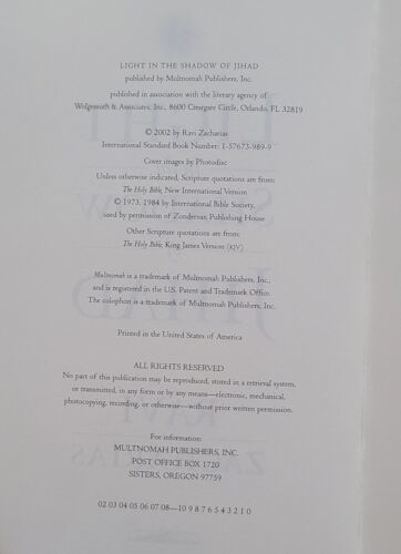 Discover the inspiring and thought-provoking book, "Light in the Shadow of Jihad: The Struggle for Truth" by Ravi Zacharias. This hardcover book measures 8.6in x 6.4in x 0.6in, with 128 pages filled with insightful views on religion, politics, and state. The book published by Doubleday Religious Publishing Group, T.H.E. in 2002, delves into the themes of terrorism, religious intolerance, persecution, and conflict, among others.