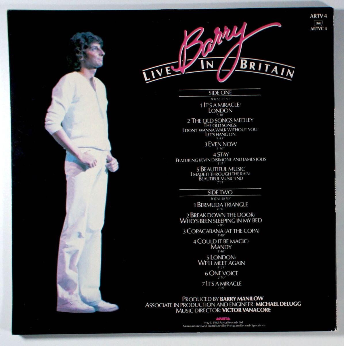 Live in Britain, by Barry Manilow, was recorded live at the Royal Albert Hall in London in January 1982 with Victor Vanacore as the musical director. It was a huge success in Britain, soaring to No. 1 on the charts, reaching platinum status. The LP contains one new song that became a hit single. Stay reached No. 23 in the UK.