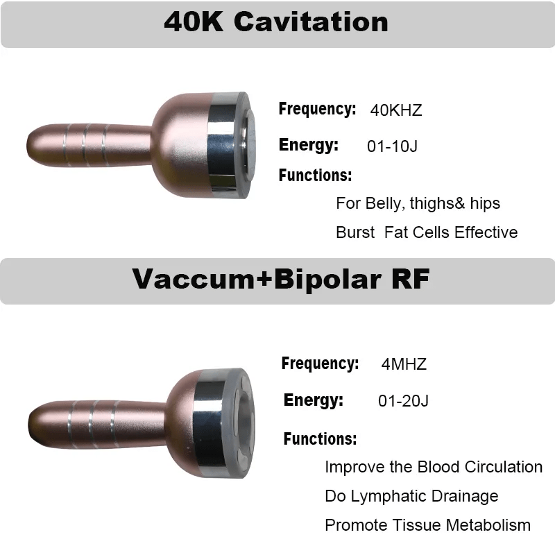 Strong cavitation targets the fatty layer, rapidly vibrating deep-seated cellulite and generating vacuum cavitations to break down fat cells, converting them into free fatty acids.