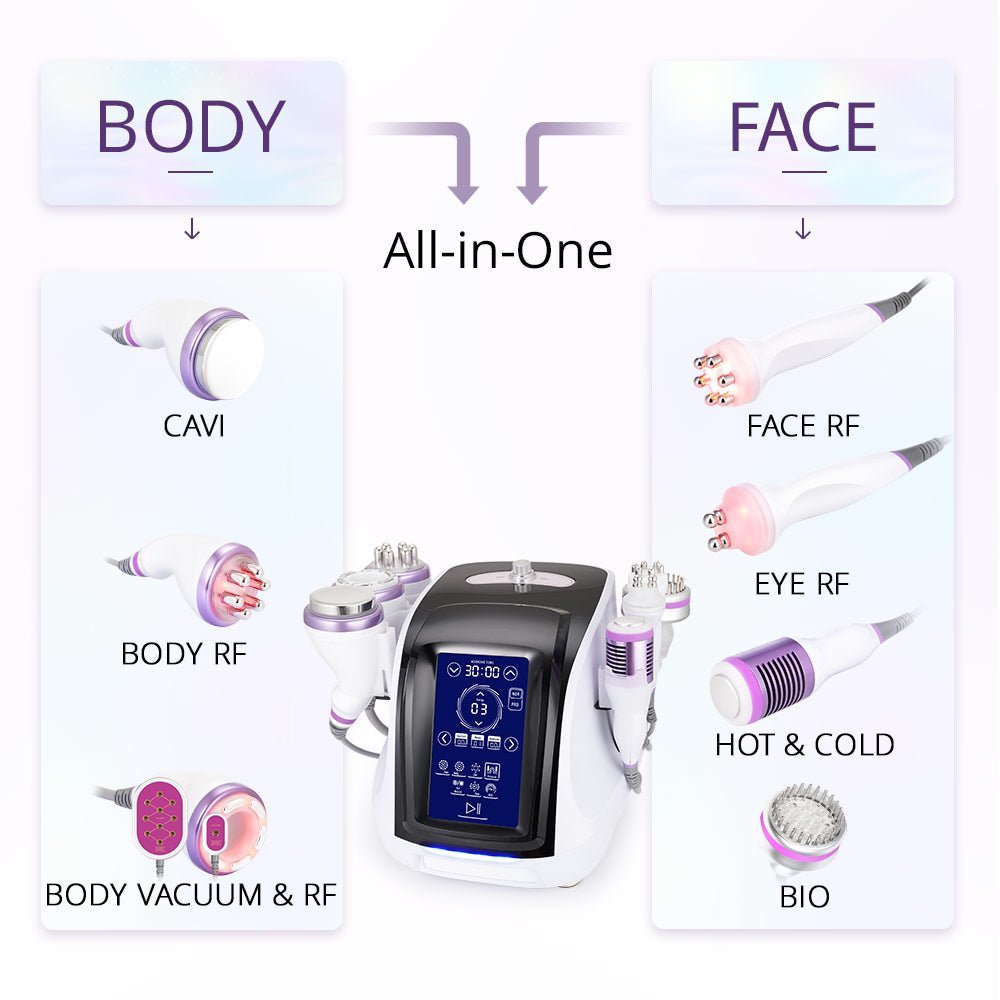 This multifunctional body and facial system combines advanced cavitation, radio frequency, vacuum therapy, microcurrent, and LED technologies to support non-invasive beauty and wellness treatments. Designed for professional use, it features Unoisetion 40K cavitation, 3D SMART RF, vacuum photon, and hot/cold therapy to promote a more contoured appearance and refreshed skin.