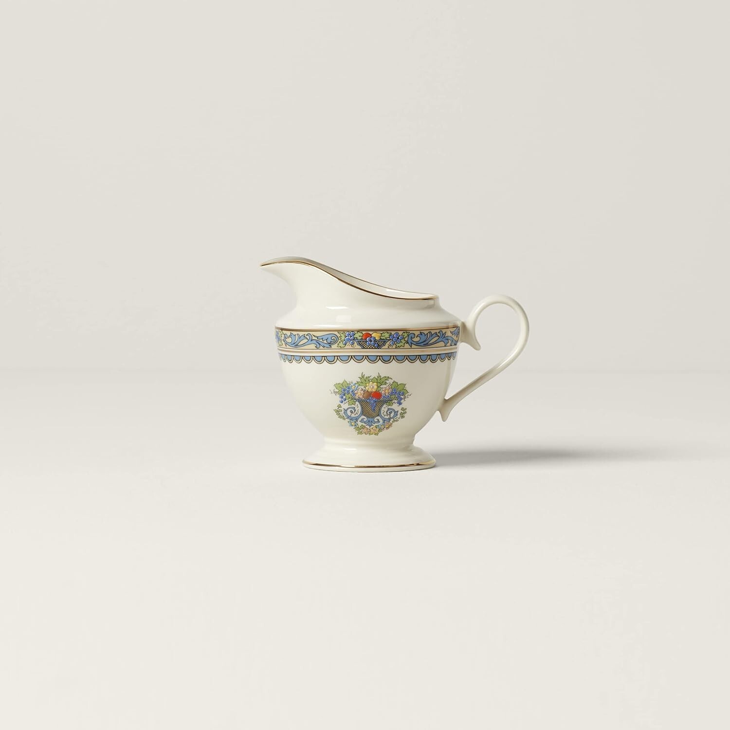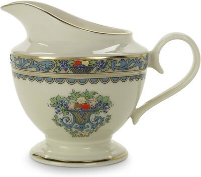 Part of the Presidential Collection, the Lenox Autumn pattern creates a mood of festive abundance. This ivory fine china creamer features an intricate band of flowers, scrollwork, leaves, and fruit, complemented by an overflowing basket on each side. Bands of 24- karat gold add understated shine to the handle, rim, body, and foot. Hand-enameled raised dots throughout the pattern brighten its quietly festive colors. With its compact circular body, tall foot, and precise pouring spout, the creamer cuts a smart profile and is satisfying to use. Like the rest of the Autumn pattern, it is dishwasher-safe and covered by Lenox's lifetime replacement policy. It measures 5-1/4 by 3-1/2 by 4 inches.