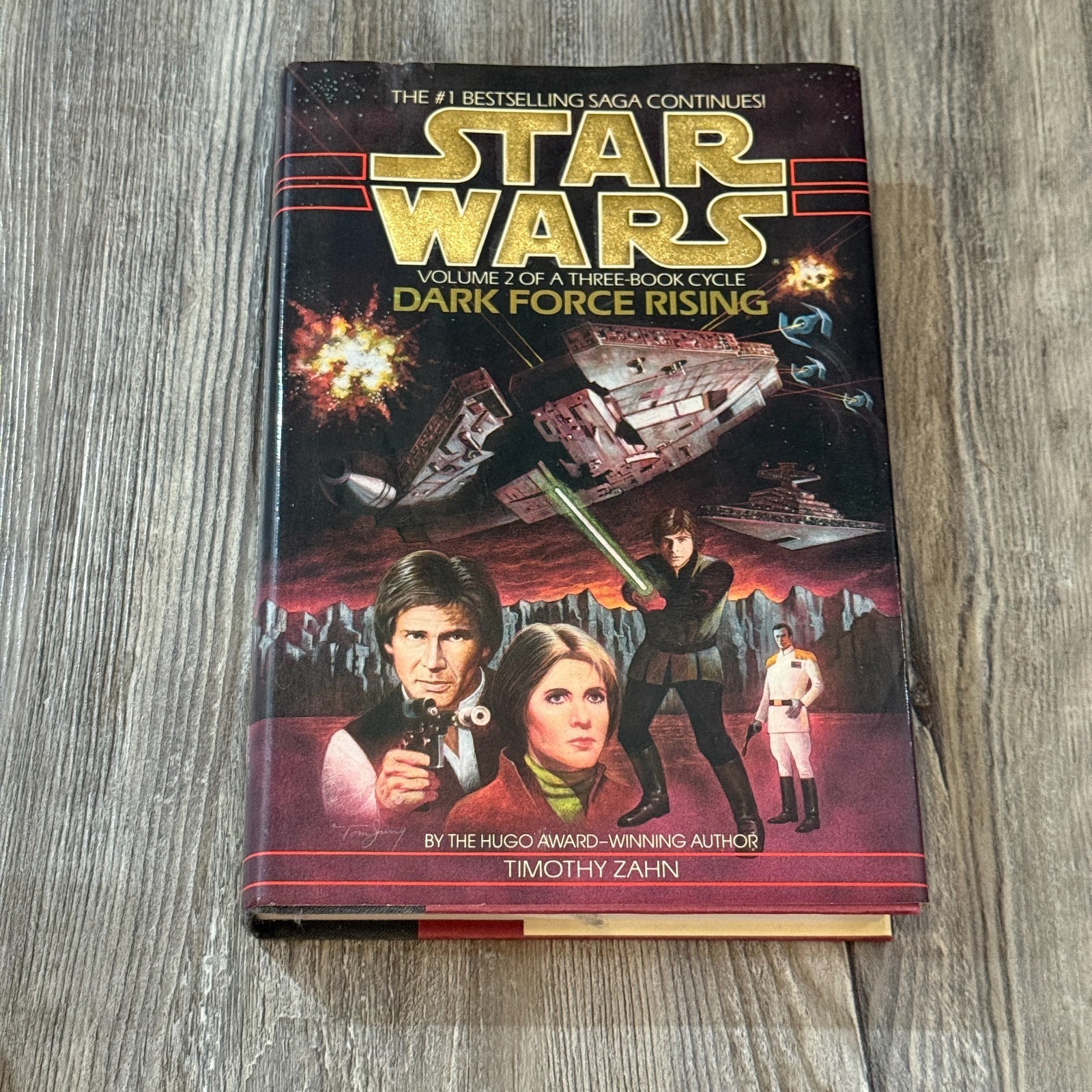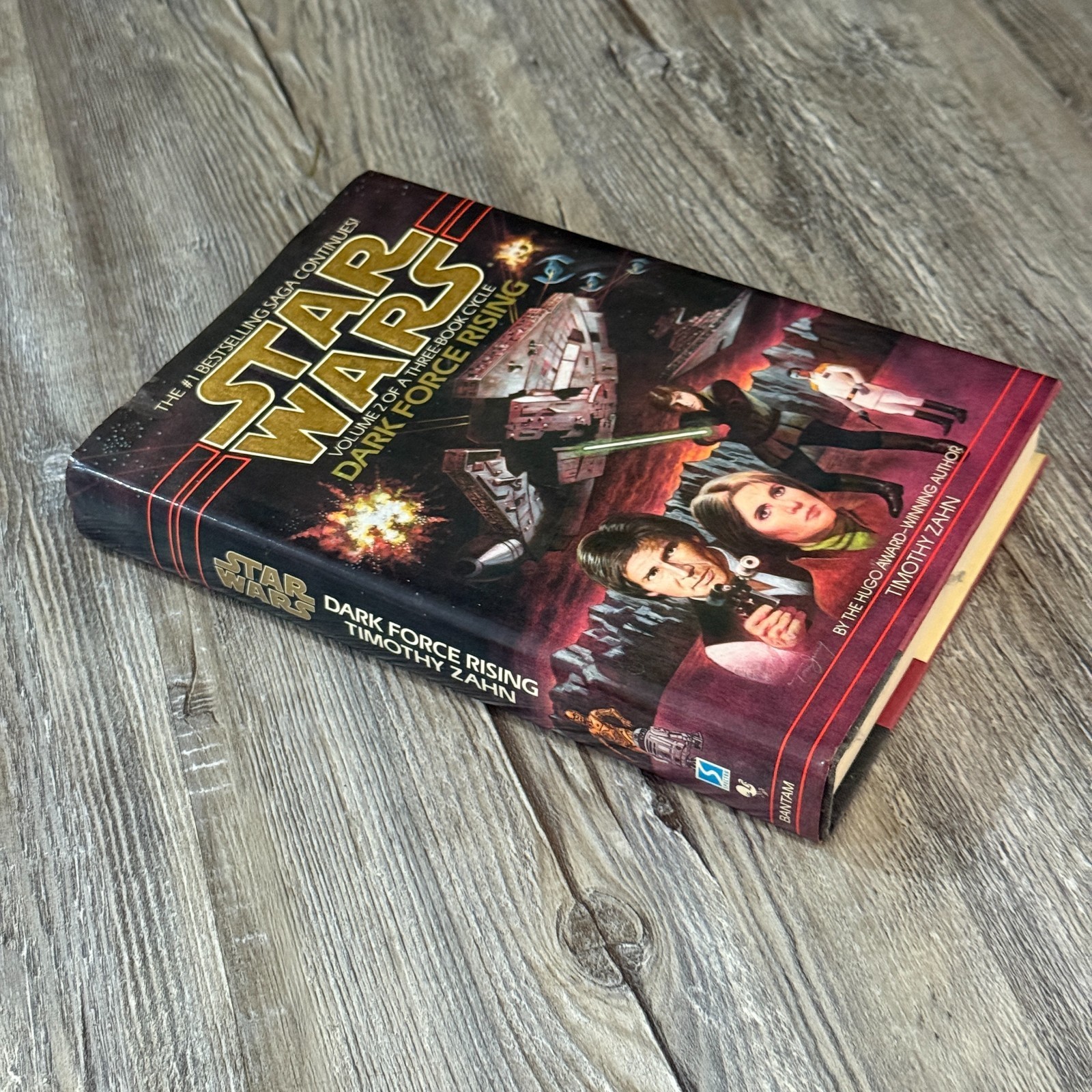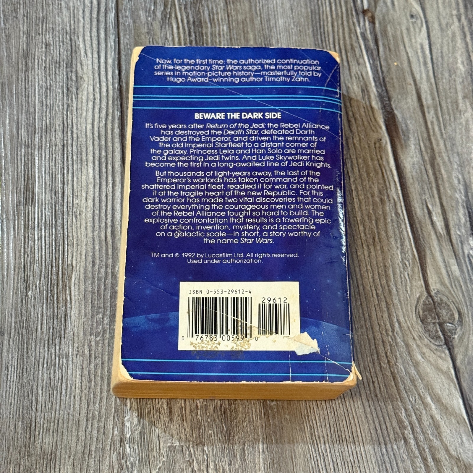 Up for sale is a lot that contains books 1 and 2 of the Thrawn Trilogy by Timothy Zahn. Volume 1 has obvious signs of wear on the front cover as it is torn at the corners and there is evidence of wear on the spine. Dark Force Rising is in much better condition! Book 1 is a paperback and book 2 is a hardcover with the dust jacket.