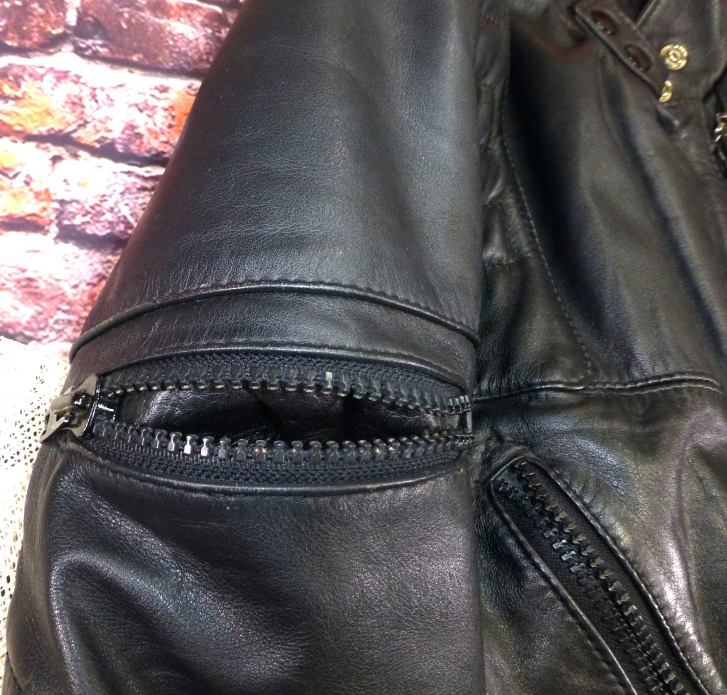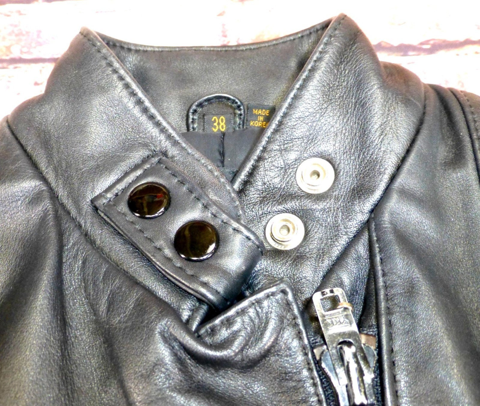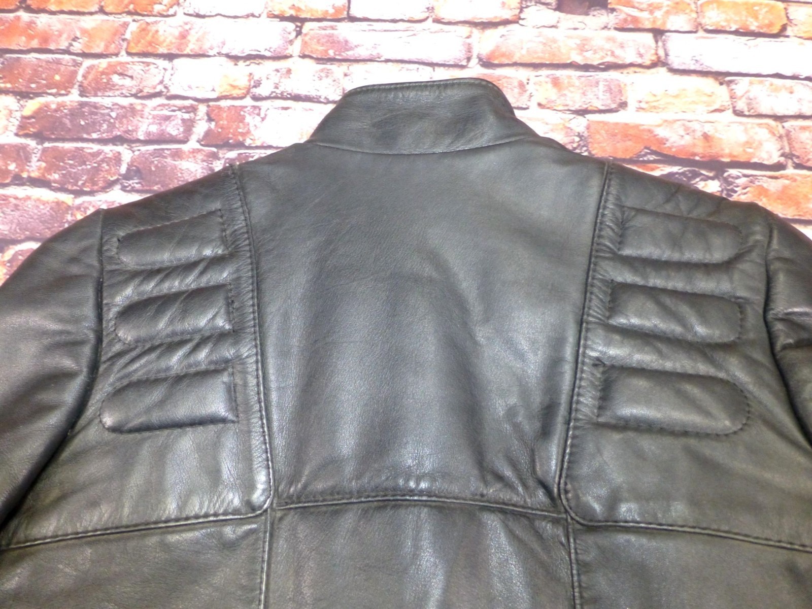 Good condition with minor wear on leather, adds character. Measurements: Chest width = 19", Body length = 23", Sleeve length = 23".