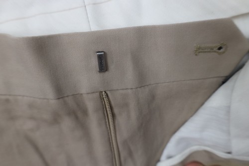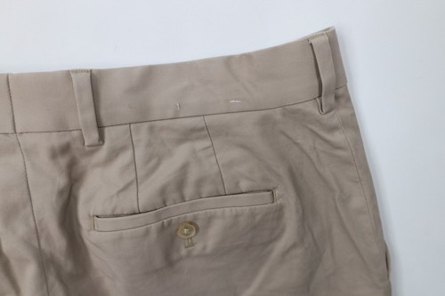 Stains front right leg. Cuffs, inner lining discolored. Color faded. Loose threads/blemishes waist