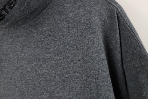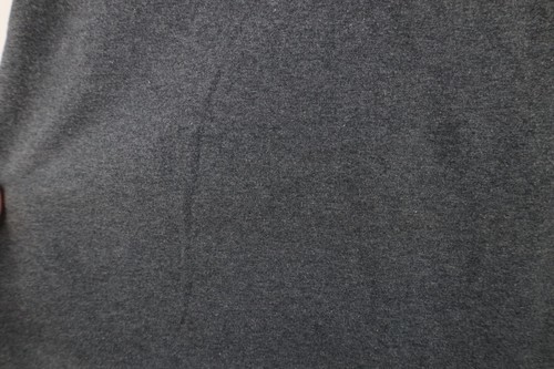 Logo distressed. Dark spots throughout. Blemish on tag. Collar, cuffs discolored. Color faded. Pilling. Made in USA
