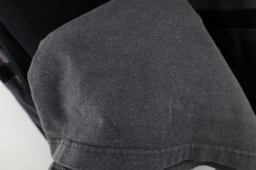 Hole front middle on black fabric. Dark spots/blemishes throughout. Collar, cuffs discolored. Pilling. Color faded