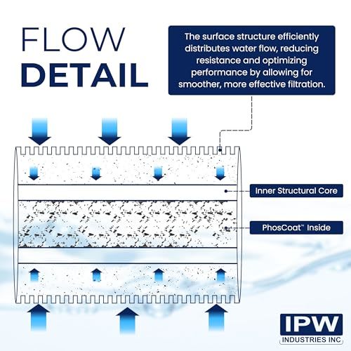 Product description: The water filter cartridge is made of a grooved polypropylene that filters sediment to 5 microns. The grooved filter allows for less pressure drop and more water contact. The filter cartridge core is filled with polyphosphate spheres which provide the essential protection to both tankless and traditional hot water tank systems. This ingredient reacts with naturally occurring calcium bicarbonates in the water supply to form a thin, tight, non-corrosive, passivating film on pipe walls. This film is almost like a glass coating, separating the water from the metal plumbing / hot water system.