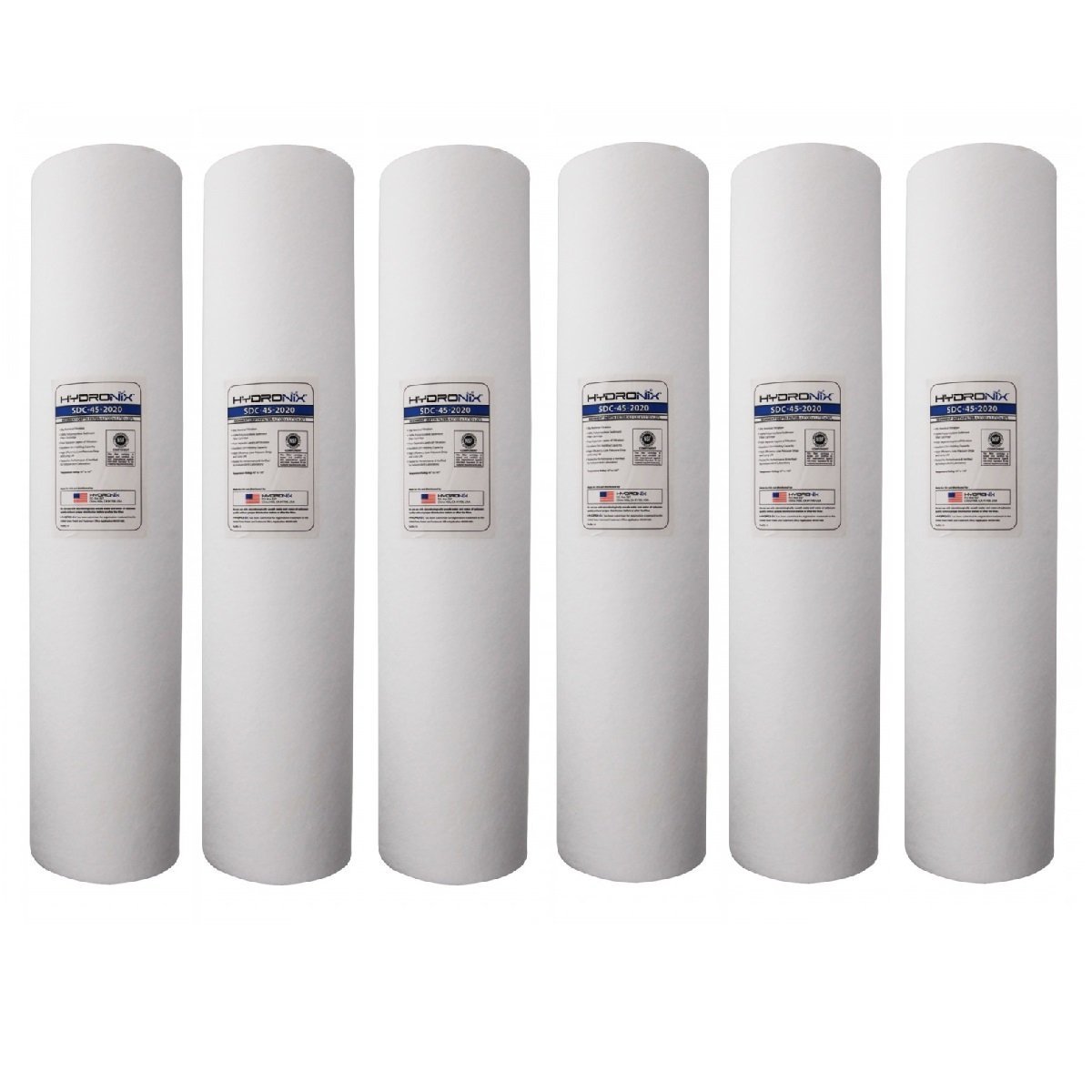 Product description: 6-pack of Hydronix SDC-45-2020 Sediment Depth Cartridges. These 20-micron sediment filters measure 20 x 4-1/2 inches. Cartridge pre-filter has graded density for higher dirt-holding capacity. Made of 100% pure polypropylene. Hydronix SDC Sediment Depth Cartridges are perfect pre-filters for GAC filters, RO systems, DI Systems, ice machines, wineries, and many more.