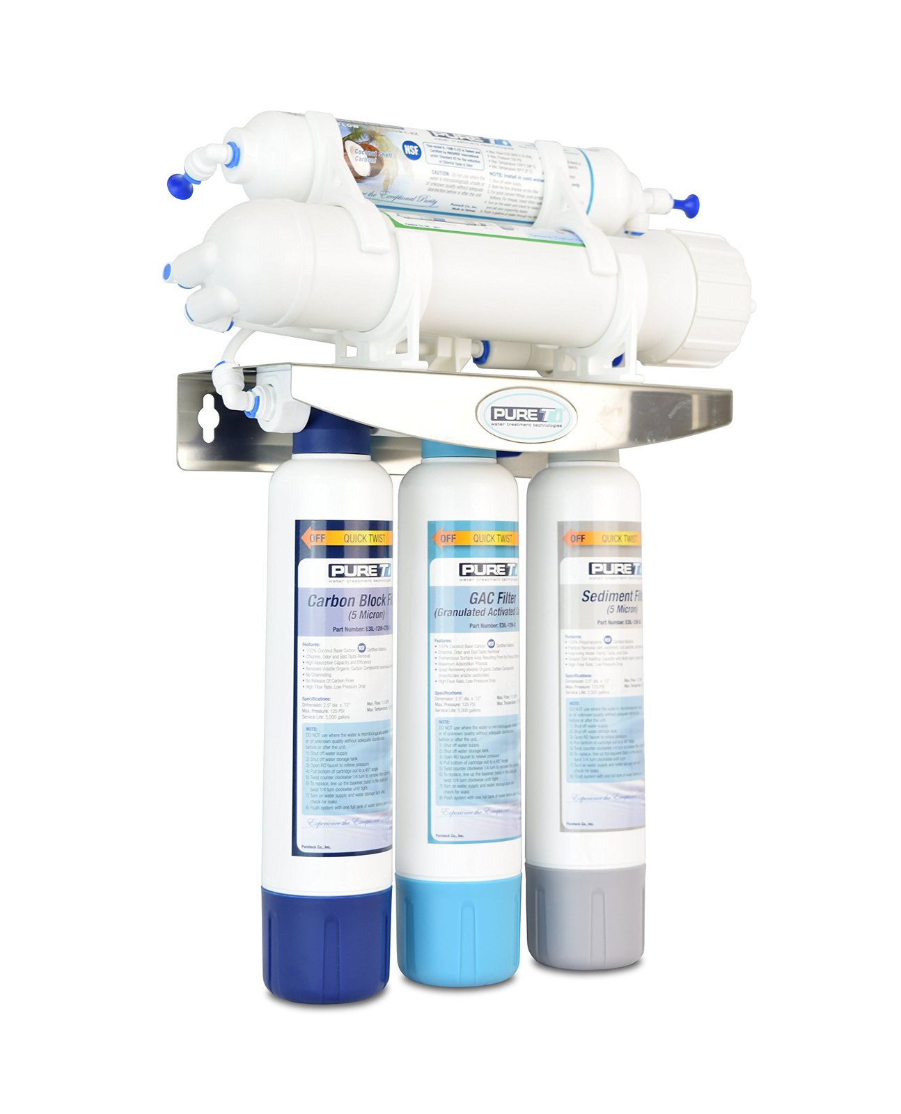 Product description: PureT branded EZ Slim 5 stage reverse osmosis filtration system. EZ Slim is the ideal water purification filter for home, office, health clubs, juice bars, coffee shops or anywhere safe, fresh-tasting water is needed. The PureT reverse osmosis system uses separate individual stages of water filtration to create pure, refreshing drinking water. The process starts by pre-filtering the water through a sediment particulate filter. Prefiltration removes tiny particles that can get into the water supply. These include iron oxide (rust), silt, sand grains and insect parts. This filtering stage protects your family from drinking sediment and prevents the filtration system from clogging. At the 2nd stage, a granilar activated carbon filter cartridge filters chlorine taste and odor. Next, water flows through an activated carbon block cartridge. This compressed activated carbon block filter removes taste and odor-causing chemicals like chlorine, chloramine and rotten-egg (hydrogen sulfide) and musty odors. The chlorine disinfection process is known to create cancer-causing byproducts in the water. These carcinogens, called THMs, are removed by the activated carbon block filter. The carbon cartridge also removes organic contaminants like herbicides, insecticides and industrial chemicals that seep into groundwater. But that?s not all. The next filtration stage involves the reverse osmosis (RO) process. Tap water is ?squeezed? through a special Thin Film Composite (TFC) semi-permeable membrane. Heavy metals, like lead, cadmium and mercury, are removed while purified water passes through. The RO process also removes salts, nitrate, fluoride, radon and benzene. The reverse osmosis membrane is NSF-certified and features outstanding efficiency. Other reverse osmosis filters can waste up to 10 gallons of water for every gallon of pure water made. Just like our own WECO RO systems, the PureT EZ Slim high-performance RO membrane produces only four gallon of waste water for each gallon of purified water. This saves you money, reduces waste water, conserves resources and helps the environment. For the final stage of purification the water flows through granular activated carbon (GAC) in-line post filter. This acts as a polishing filter, removing any traces of tastes, odors or gasses, for crystal clear, sparkling drinking water.