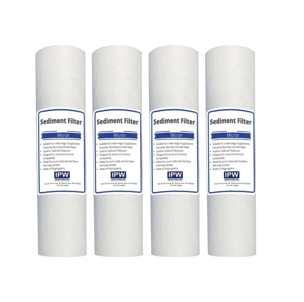 Product description: Compatible with Deluxe Sediment 38480 Filter Cartridges (4-Pack) by IPW Industries Inc. Economical light weight filters for standard 10" housings. IPW Industries Inc sediment filter cartridge's coreless design is an economical solution to pre-filtration for many applications. These are used widely as pre-filtration for RO systems and whole house filtration for high sediment water sources. They are also used in applications such as Ice Machines, Film Processing, Beverage, Coffee, Analytical, Wineries, and many others. Polypropylene Sediment, Multi-layer structure nominal micron rating. Reduces fine sediment, sand, silt, rust and precipitated scale Suitable for Municipal and well water 10" x 2.5" Filter Nominal 1 Micron Filtration This filter set includes: (x4) 1 Micron, 100% polypropylene sediment filter SEDIMENT FILTER Economical light weight filters for standard 10" housings. IPW Industries Inc sediment filter cartridge's coreless design is an economical solution to pre-filtration for many applications. These are used widely as pre-filtration for RO systems and whole house filtration for high sediment water sources. They are also used in applications such as Ice Machines, Film Processing, Beverage, Coffee, Analytical, Wineries, and many others. 1 Micron, 100% Polypropylene Sediment Reduces fine sediment, sand, silt, rust and precipitated scale Suitable for Municipal and well water 10" x 2.5" Filter 1 Micron Filtration
