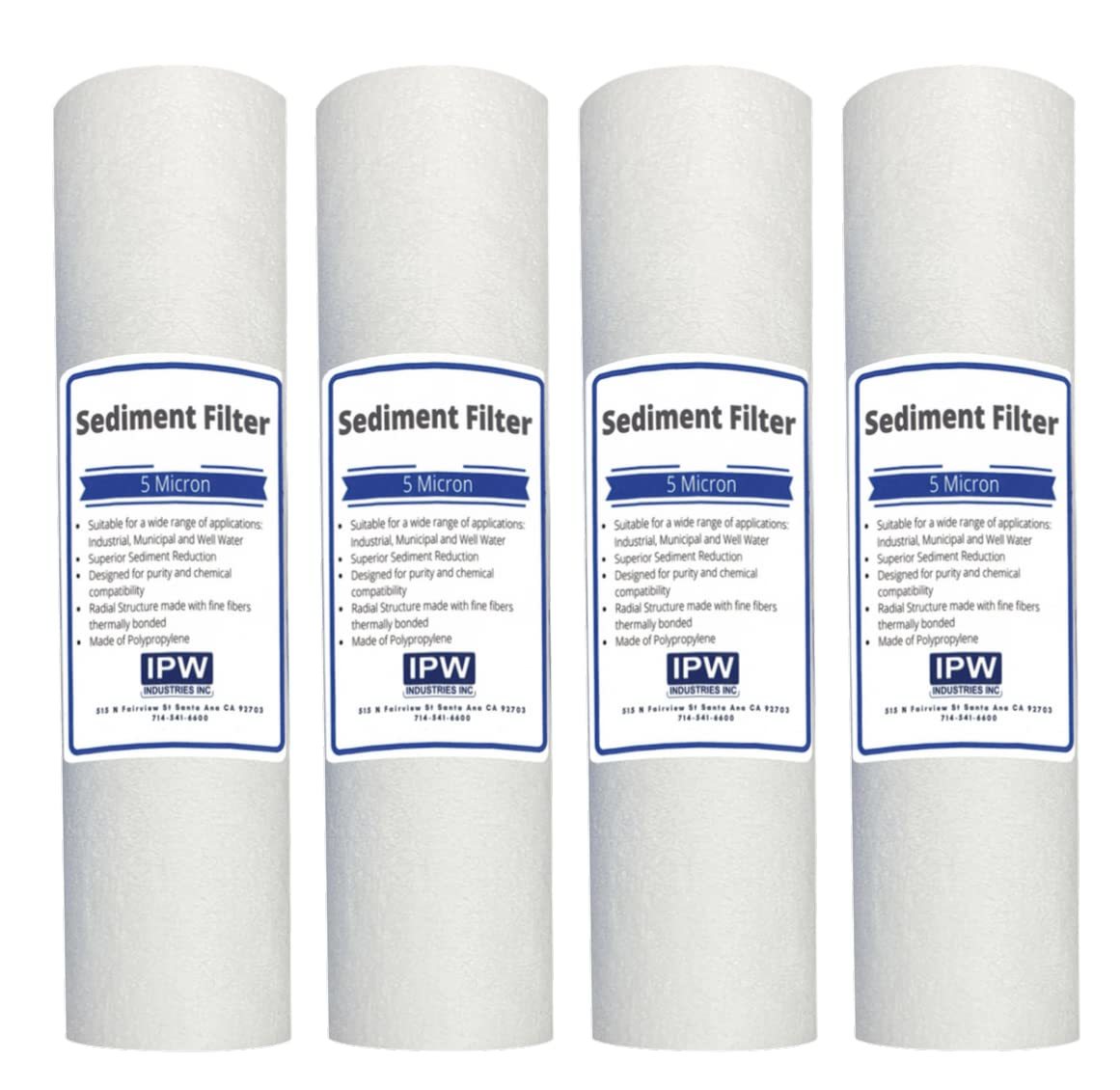 IPW Industries 5 micron water filter 10 x 2.5 replacement cartridge 4-pack delivers premium whole house water filter replacement performance for comprehensive sediment water filter applications. Each whole house sediment filter cartridge features 100% polypropylene construction with coreless design, providing economical whole house water filtration solutions for standard 10" housings. These sediment filter cartridge units effectively lessen fine sediment, sand, silt, rust, and precipitated scale from municipal and well water sources, making them ideal sediment filters for well water systems. Compatible with Dupont WFPFC5002 and Pentek DGD series, these reverse osmosis filter replacement cartridges serve as essential sediment pre-filter protection for reverse osmosis water filter systems and whole house ro system installations. With 6-12 months filter lifetime depending on water quality, these water filters whole house compatible cartridges maintain consistent whole house water filter performance throughout their service life. Perfect for diverse commercial applications including ice machines, film processing, beverage systems, coffee equipment, analytical systems, and wineries, these 2.5 x 10 water filter cartridges deliver reliable whole home water filteration solutions. Backed by IPW Industries' 17 years of expertise and Water Quality Association membership, these whole house filter cartridge units provide professional-grade water sediment filter performance for residential and commercial wholehouse water filter system.