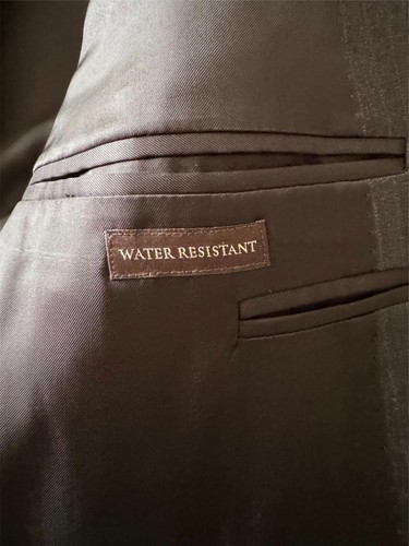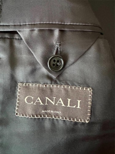 This Canali wool charcoal gray jacket is in excellent pre-owned condition aside from a small repair (as shown in the photo). It features: