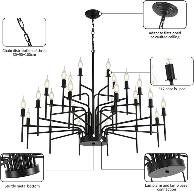 BLACK FARMHOUSE DINING ROOM CHANDELIER LIGHT FIXTURES OVER TABLE: The large 24 light chandelier black light fixture is crafted from metal. ?Peonacy candlestick chandelier frame strikes a classic retro candle style, accentuated by a sophisticated matte black finish, imbues the chandelier with a timeless allure and rustic charm. Beyond brightening your abode, the modern matte black iron chandelier for living room is also a good choice as house housewarming or festival present.