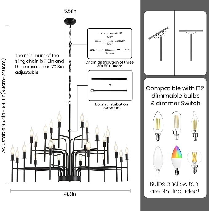 MODERN FARMHOUSE CHANDELIERS FOR DINING ROOM LIGHT FIXTURES OVER TABLE BULB REQUIREMENTS: The ?Peonacy black dining room chandelier light fixture requires 24 x E12 bulbs (Max 40W per bulb). Compatible with LED, Edison, CFL, incandescent, and halogen bulbs (Bulb not included). 41 inch wide extra large large foyer chandelier high ceiling chandelier also works with dimmable bulbs with a compatible dimmer switch (Bulbs and Switch are Not Included).Recommended use of LED bulbs 5-7W.