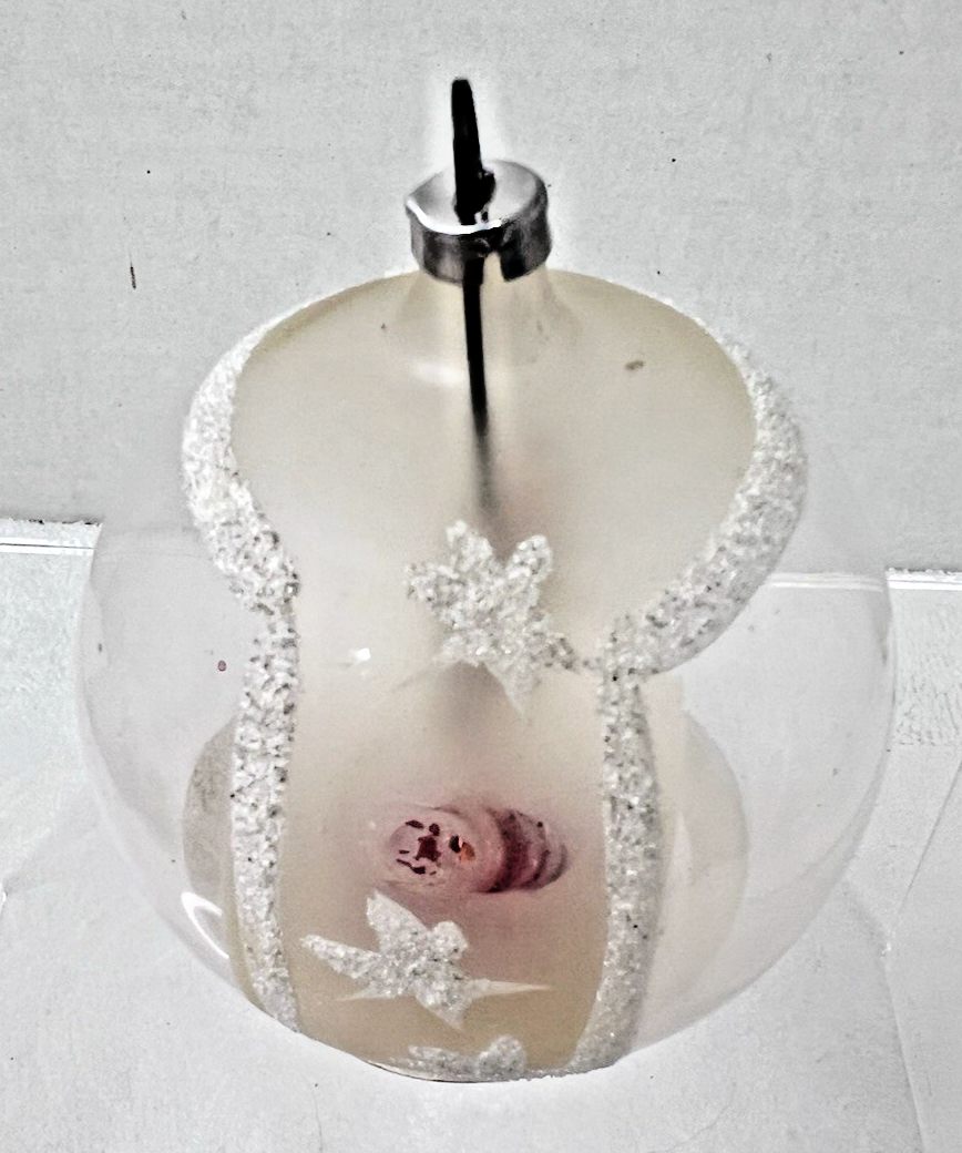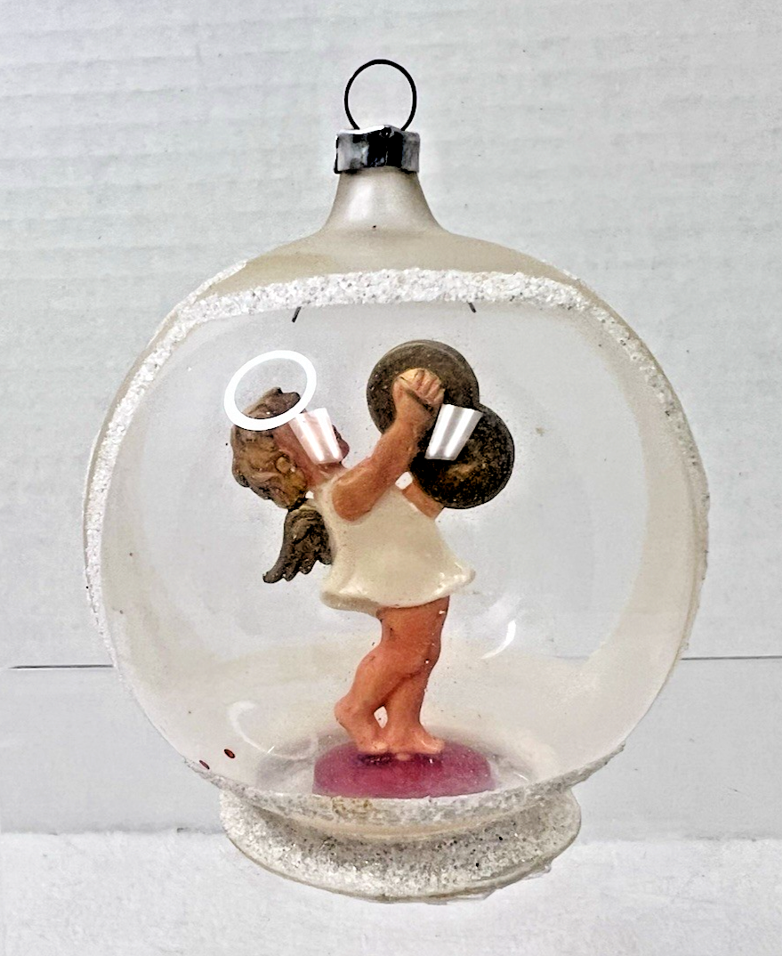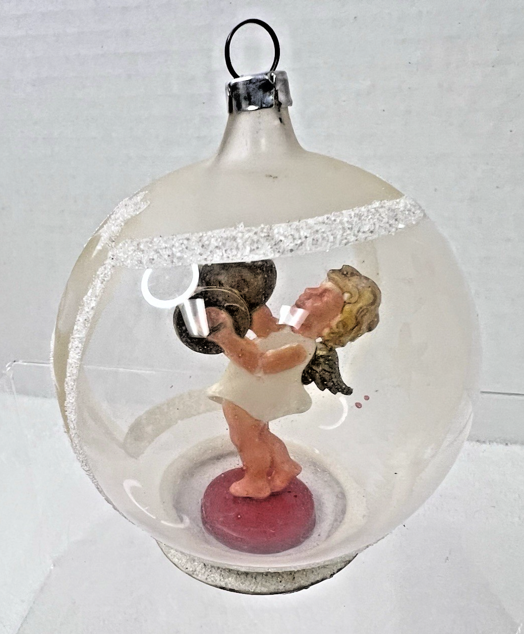 VTG DIORAMA Angel Playing Cymbals w Sugar Mica Stars Glass Christmas Ornament
