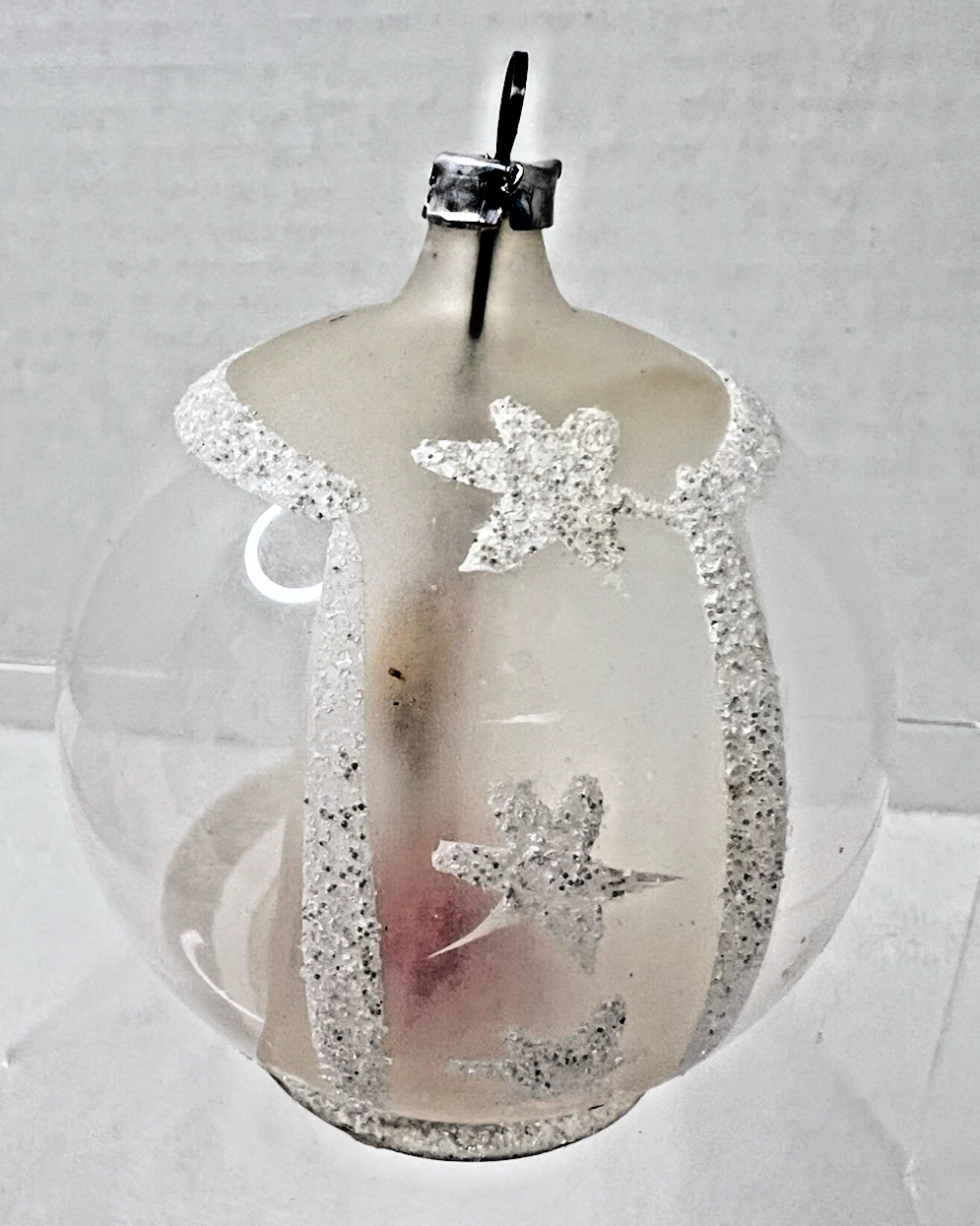 VTG DIORAMA Angel Playing Cymbals w Sugar Mica Stars Glass Christmas Ornament overall great shape 3.5 to top of hanger and about 2 3/4 wide base will sit flat so it doesn't have to be hung