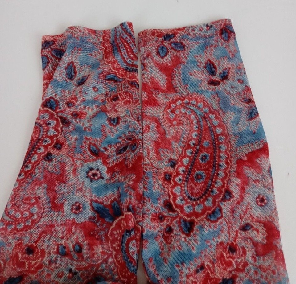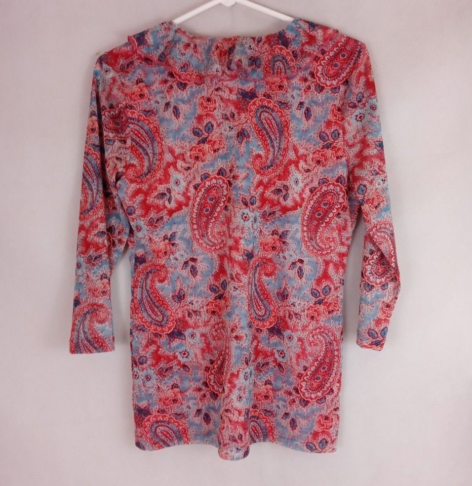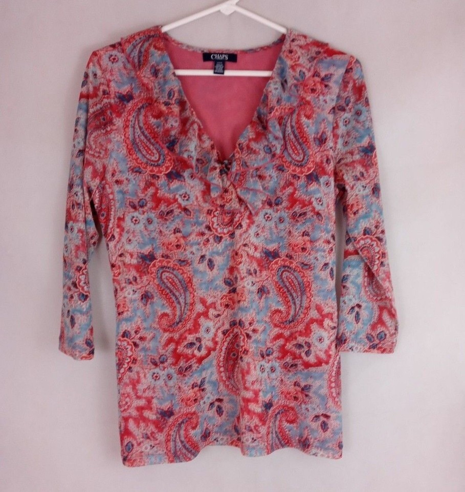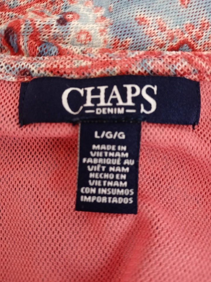 This is for a Chaps Women's Pink Blue Sheer Lined Floral Paisley Ruffled Blouse Large.