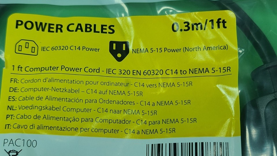 SPECS: 1ft (0.3m) AC Power Cord | IEC 60320 C14 to NEMA 5-15R | 18AWG | 125V 10A (Max) | Jacket Type: SVT | Jacket Material: PVC | Black | Temperature Range: 37F to 140F (3C to 60C) | Cable Outer Diameter: 0.24in (6.1mm)
