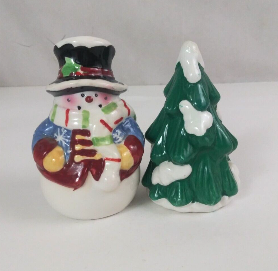 Vintage Big Lead China Snowman & Christmas Tree 3.75" Salt & Pepper Shakers