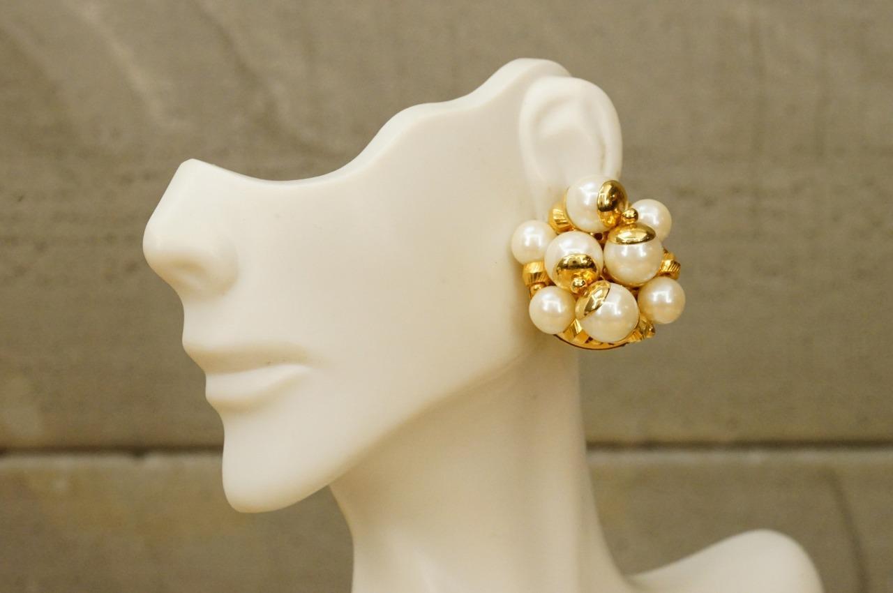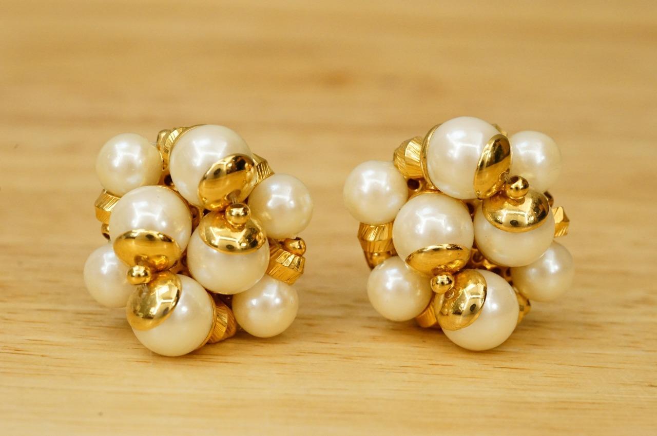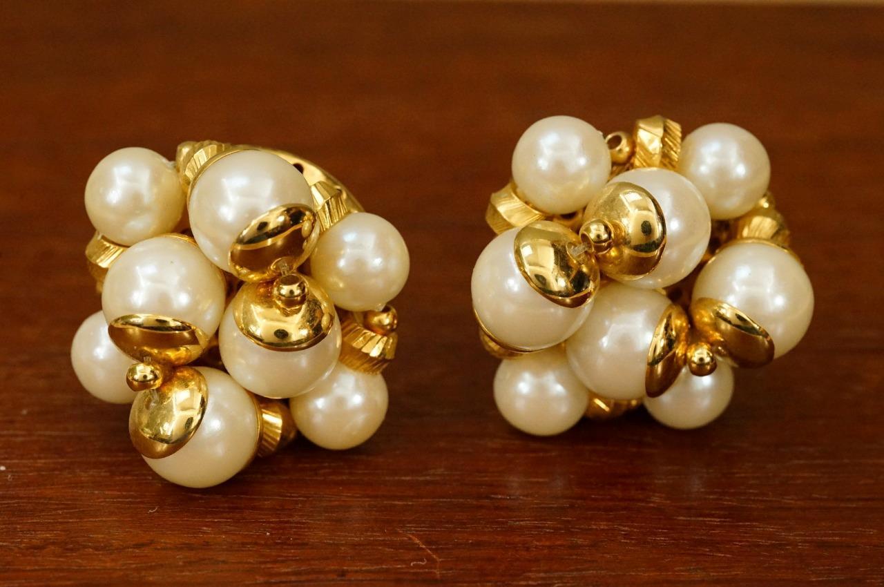 Vintage Costume Jewelry Trifari Faux Pearl Cluster Bold Goldtone Clip Earrings