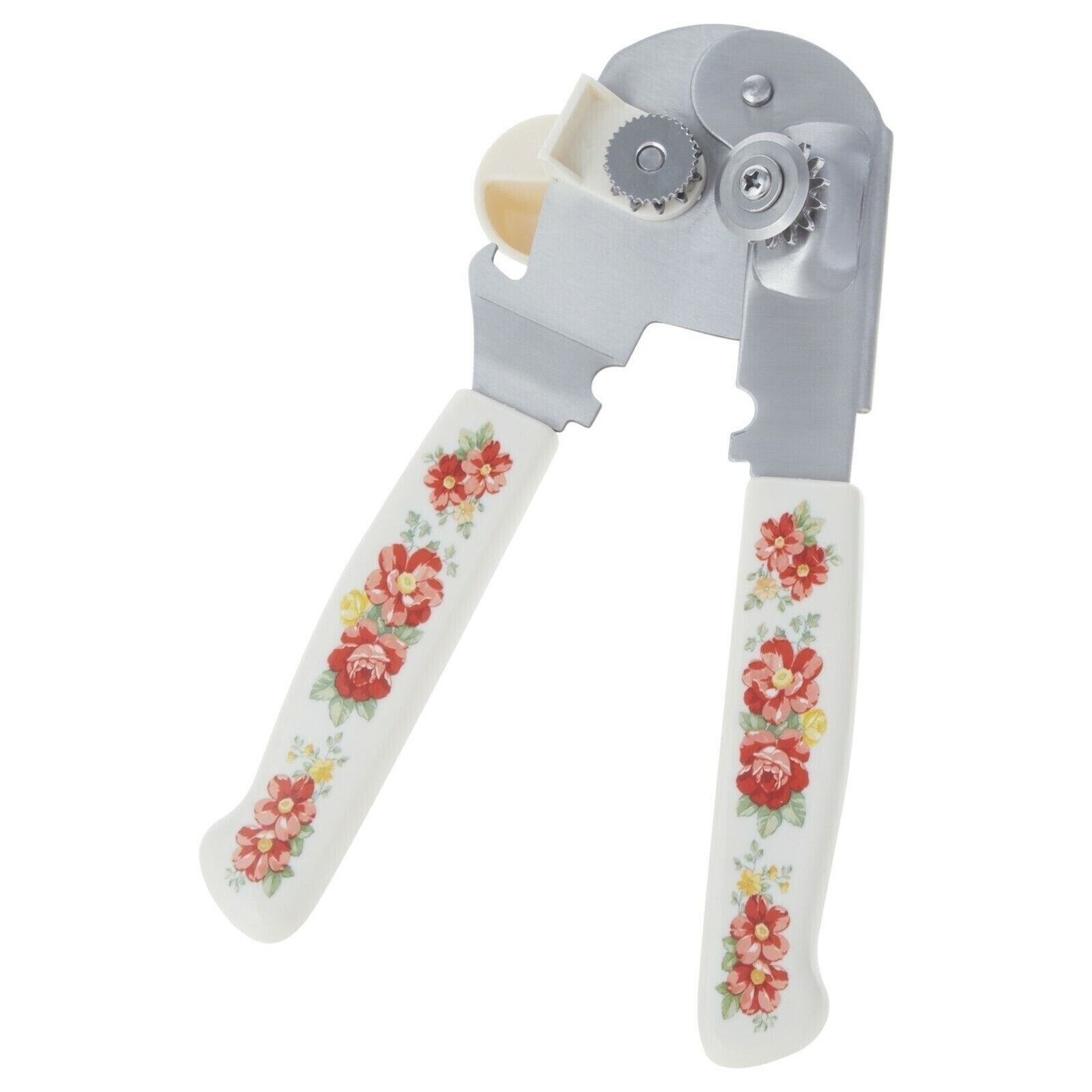 The Pioneer Woman Vintage Floral Can Opener. Weighted and balanced gear-driven can opener with contoured handles includes an oversized knob for smooth motion and built-in bottle opener. Brand new, still in original retail packaging. Our items come from a non-smoking and pet-free environment. Fast shipping always!