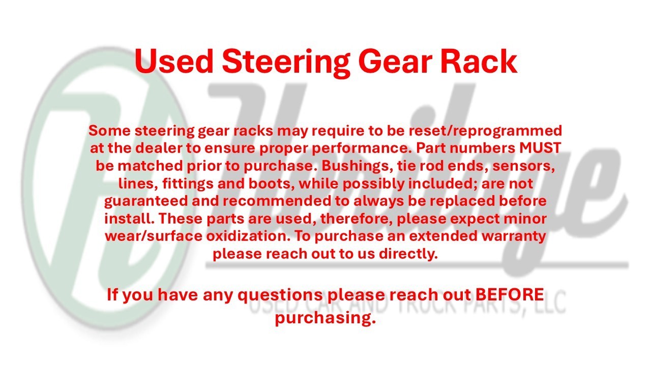 Some vehicles have different specs that must be matched to ensure fit. If you have any questions about if this part will fit your vehicle, please call or text 251-375-2135. Used Steering Gear Rack and Pinion Assembly. Steering racks/boxes are sold as pictured. Please see pictures for reference of what is included. Bushings, tie rod ends, sensors, lines, fittings and boots, while possibly included; are not guaranteed and recommended to always be replaced before install. These parts are used, therefore, please expect minor wear/surface oxidization. If you have any questions regarding fitment, please contact us before purchasing.
