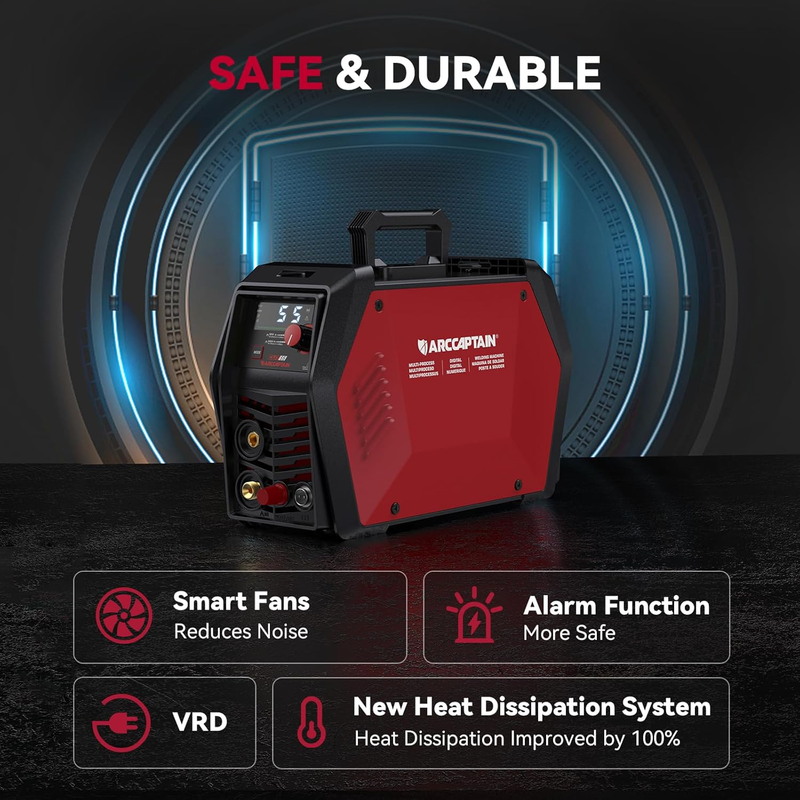 SAFETY AND DURABILITY: Equipped with a smart fan and advanced cooling system that cuts noise by 50%, doubles cooling efficiency, and extends machine life by 50%. Waterproof, dustproof, and corrosion-resistant, it lowers failure risk by 70%. Features VRD function, fault alarms, and protection against overcurrent, overvoltage, overload, and overheating. Certified by TÜV and ANSI.