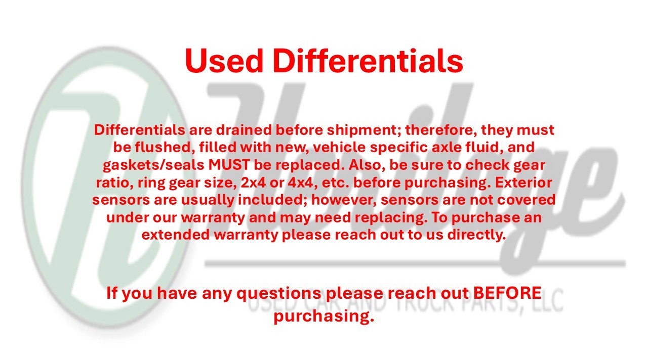 Some vehicles have different specs that must be matched to ensure fit. If you have any questions about if this part will fit your vehicle, please call or text 251-375-2135 Differential Assemblies are sold as excellent working used parts. Exterior sensors are usually included, however, sensors are not covered under our warranty and may need replacing. Axle shafts are usually not included, please see pictures as a reference. Differentials are drained before shipment, therefore, they must be flushed, filled with new, specific fluid, and seals replaced. Also, be sure to check gear ratio, ring gear size, 2x4 or AWD, etc. before purchasing. Differentials are considered a freight item. All heavy or large freight items must be shipped to business address or picked up at a freight terminal. Hospitals, Schools, Home Business, and Military Base are not accepted as a valid zoned business. Terminal locations can be located by supplying your zip code to us. Liftgates and residential deliver are subjected to additional charges. Customers are responsible for the unloading of the item off the freight tuck. Attention: If you order an item incorrectly or if it is just not needed, this does not fall under buyer protection or our warranty. You may return the part but actual shipping costs incurred will not be refundable.