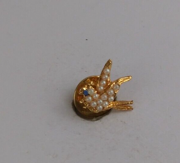This is for a Vintage Tiny Faux Pearl Bird With Blue Jewel Eye Gold Tone Lapel Hat Pin.