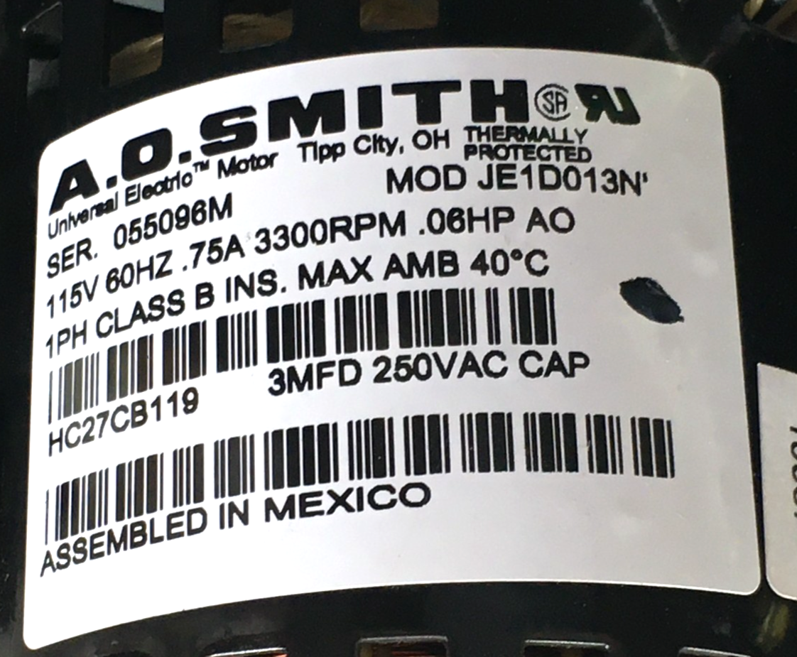 This is A.O. SMITH JE1D013N Carrier Bryant Draft Inducer Blower Motor HC27CB119 115V 3300 RPM .06HP used part.