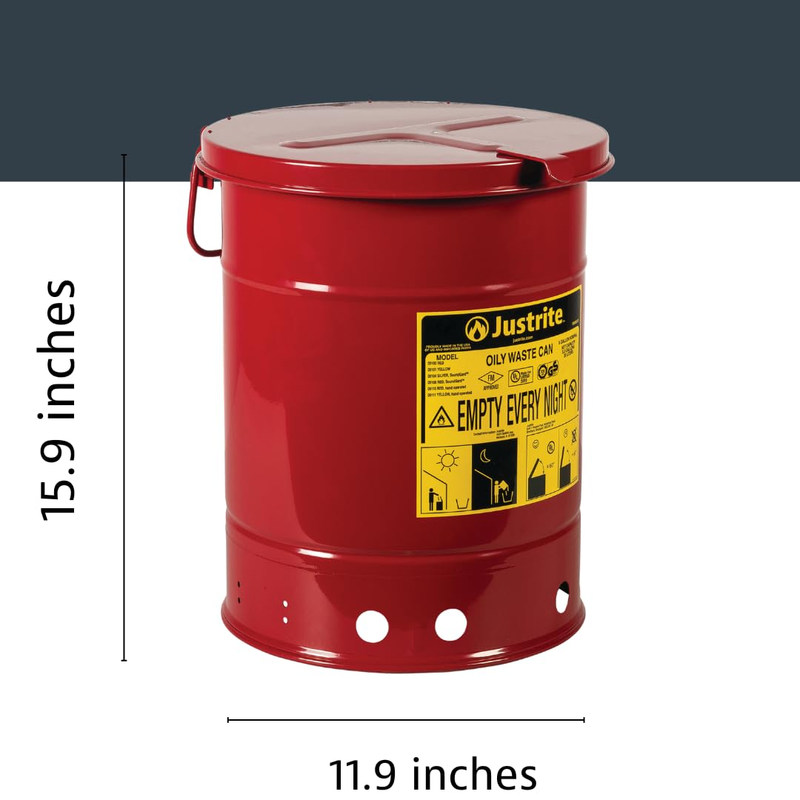 Revolutionize your workspace with an American-made Justrite oily waste can, a necessity in workshop accessories and auto shop supplies. Engineered for superior safety and durability, our oily waste can is an essential fireproof storage upgrade for any workshop, auto shop, or laboratory. Unlike a traditional metal trash can, our oily waste can features a self-closing lid that remains securely shut when not in use. This innovative design isolates its contents from potential fire sources and dramatically limits oxygen availability, minimizing the risk of spontaneous combustion. The can's construction is robust, crafted from durable steel with a powder-coat finish for exceptional chemical resistance, far exceeding the capabilities of any other flammable storage can or fire safe trash can. Justrite oily waste cans are designed with an elevated base to promote air circulation around the can. This not only disperses heat but also minimizes moisture build-up and rusting. Additionally, the swinging carry handle makes it effortlessly portable, essential for dynamic and varied work environments. With FM and UL/ULC approvals, and OSHA compliance, our oily waste can provides a reliable, safe, and efficient solution for disposing of flammable waste. Choose a Justrite oily waste can for a safer and more efficient workspace, and elevate the standard of safety in your workshop or auto shop today. Founded in 1906, Justrite is a leading manufacturer of storage, handling, and workplace safety products. Today, Justrite is a global leader in the design and manufacturing of products for the safe management of flammable liquids and hazardous materials.