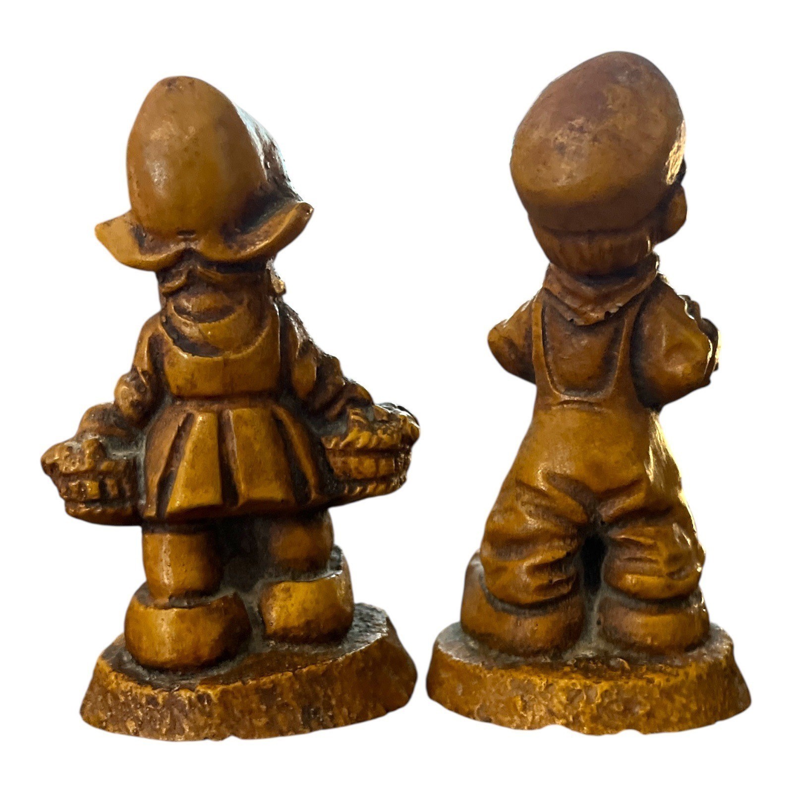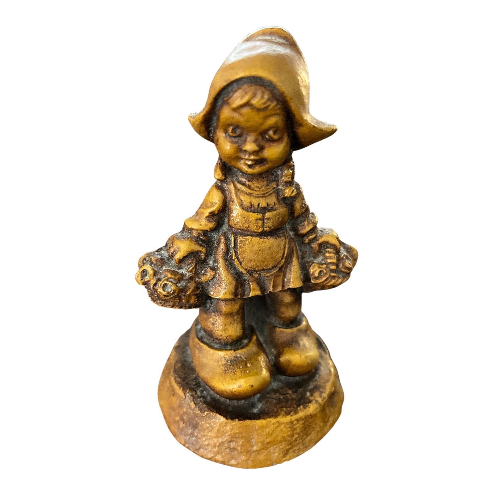 Add a whimsical touch to your shelf or windowsill with this delightful pair of vintage figurines. Styled in a Dutch or European folk art design, the boy plays an accordion while the girl carries baskets of flowers. Their warm bronze-tone finish and expressive faces make them a lovely addition to any rustic or nostalgic decor.