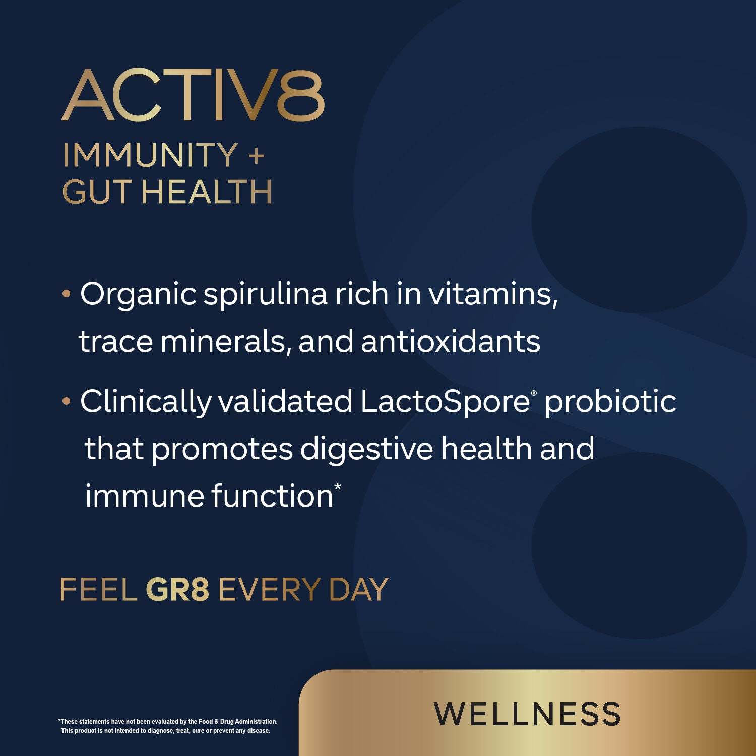 ACTIV8 is more than nutrition?it?s precision-formulated support for those who push boundaries and expect the best from their bodies. A revolutionary approach to total-body wellness, ACTIV8 fuels your body with all the building blocks it needs to thrive. Supports gut health and digestion for powerful immune support from the inside out.*
