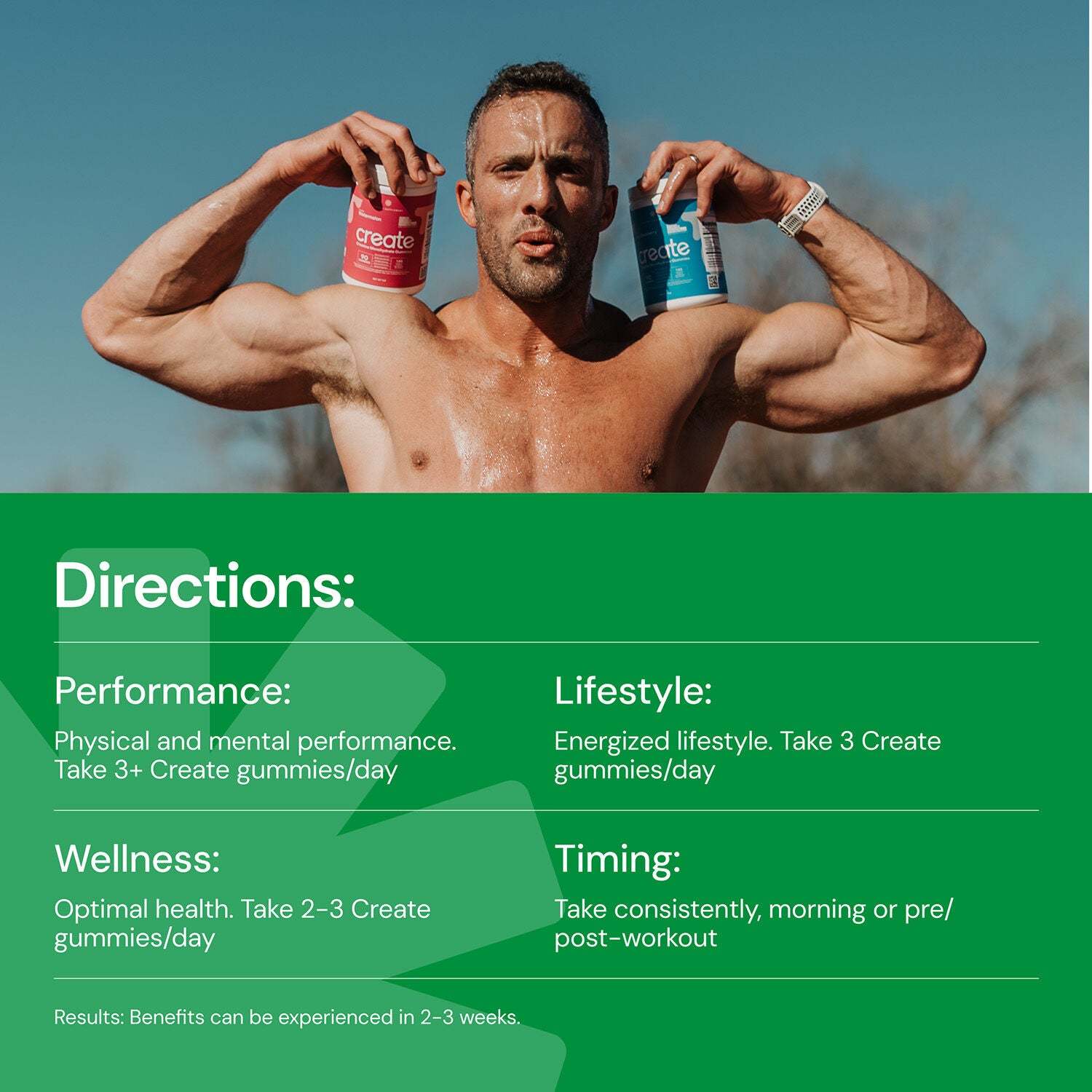 Create is the first modern creatine brand. We stand for approachability, science-backed results, wellness through fitness, and product innovation. If you live an active lifestyle, our creatine monohydrate gummy is a tasty and convenient source of this very beneficial nutrient!