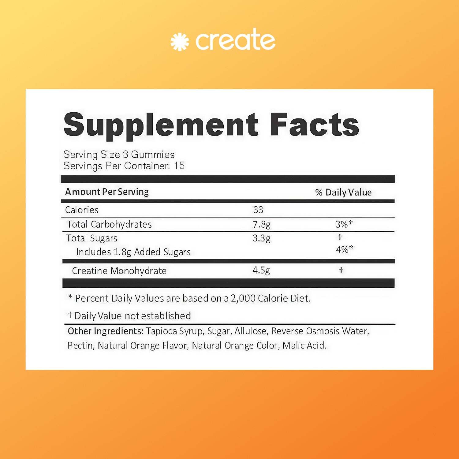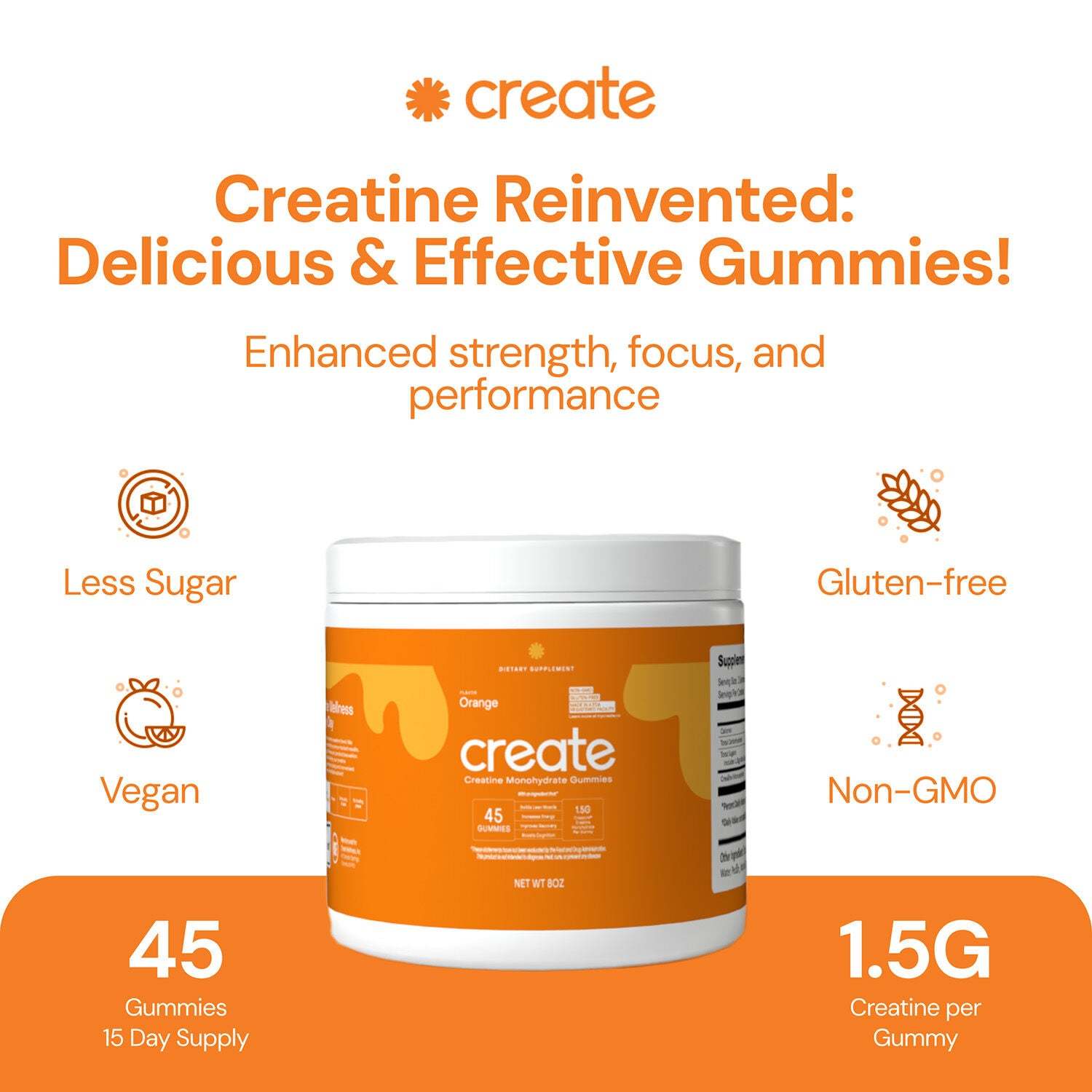 Create is the first modern creatine brand. We stand for approachability, science-backed results, wellness through fitness, and product innovation. If you live an active lifestyle, our creatine monohydrate gummy is a tasty and convenient source of this very beneficial nutrient!