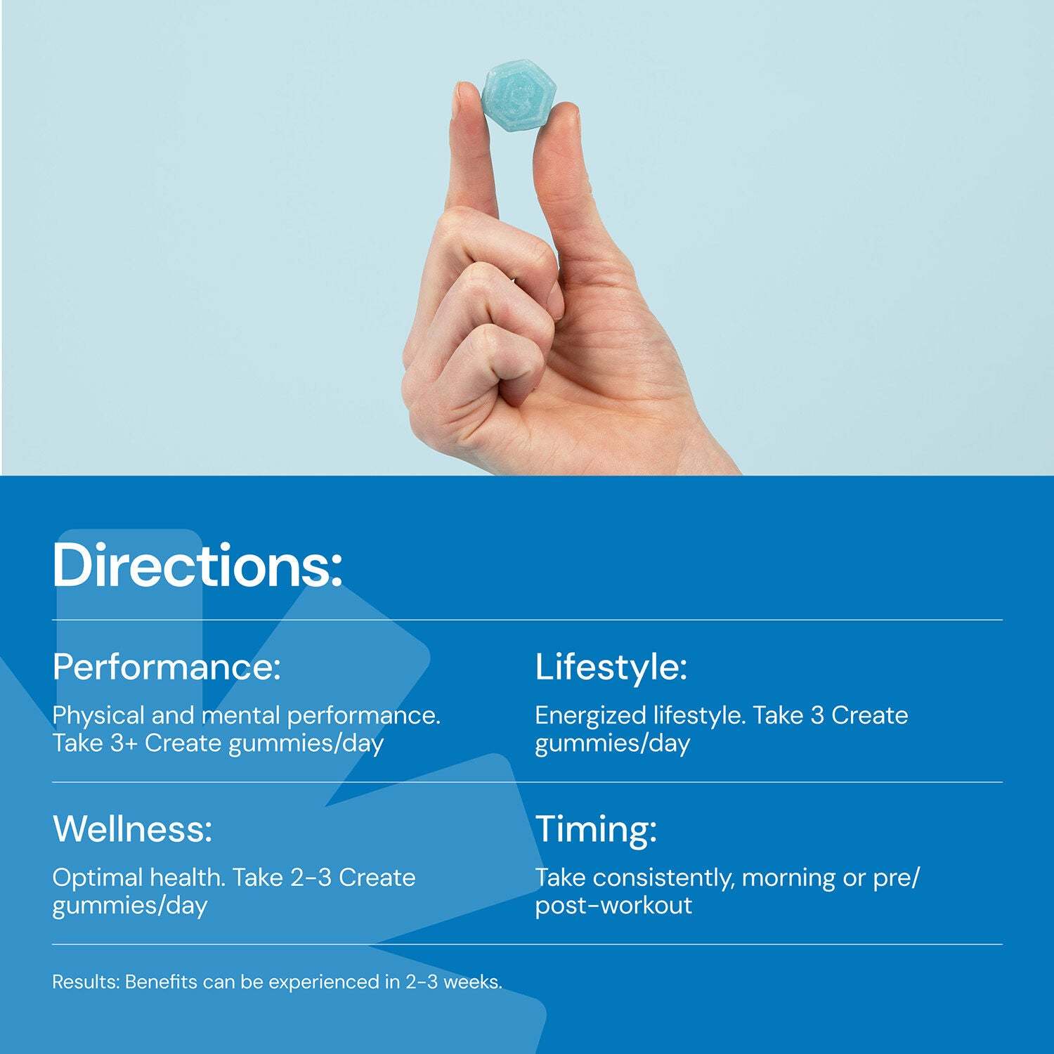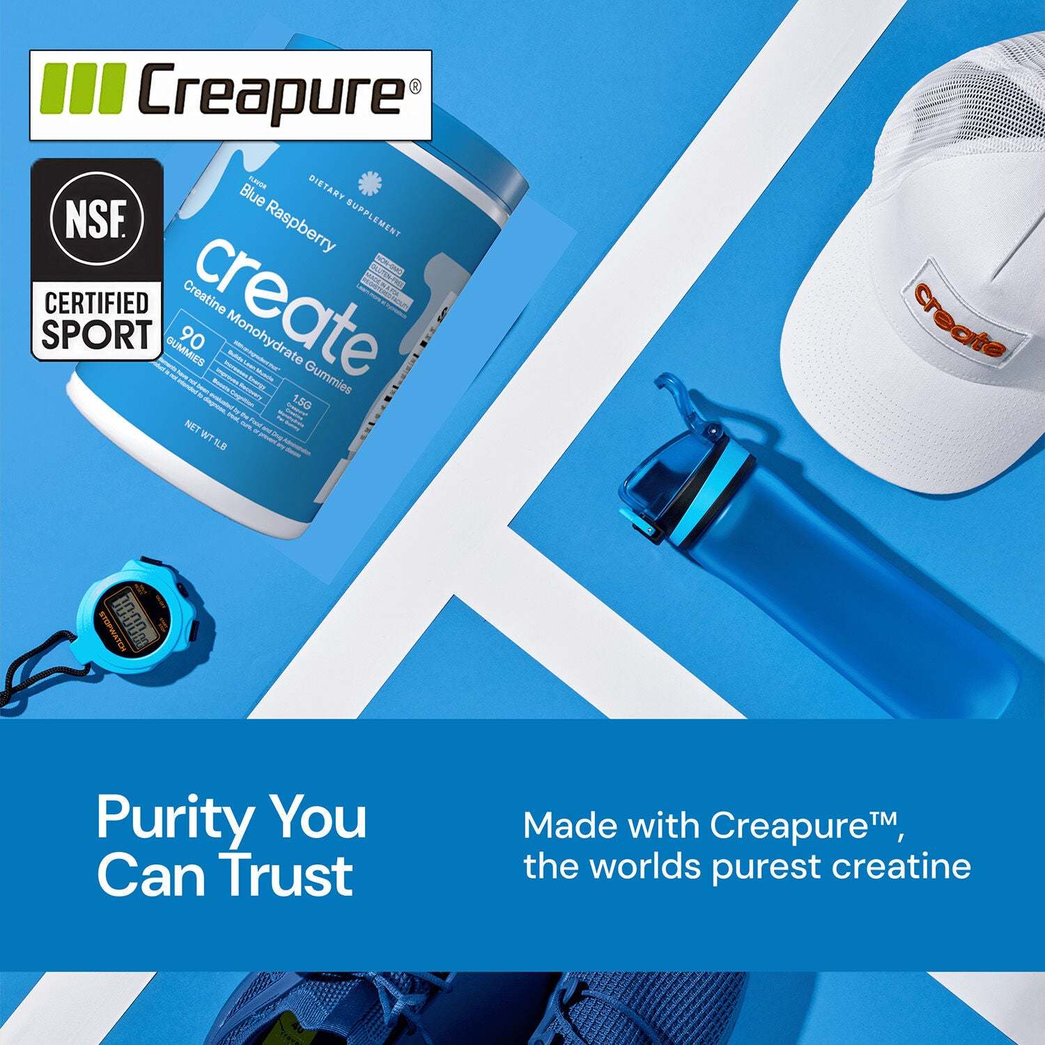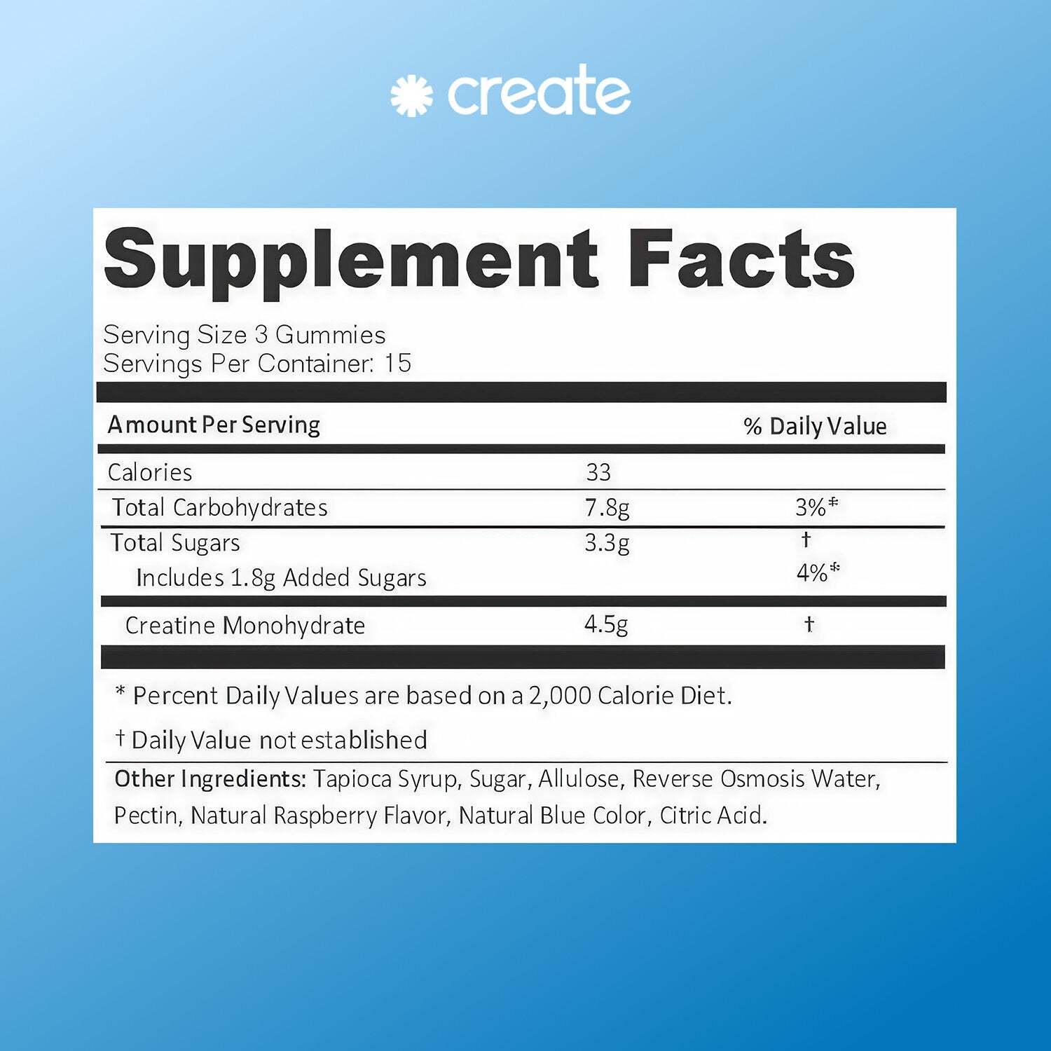 Create is the first modern creatine brand. We stand for approachability, science-backed results, wellness through fitness, and product innovation. If you live an active lifestyle, our creatine monohydrate gummy is a tasty and convenient source of this very beneficial nutrient!