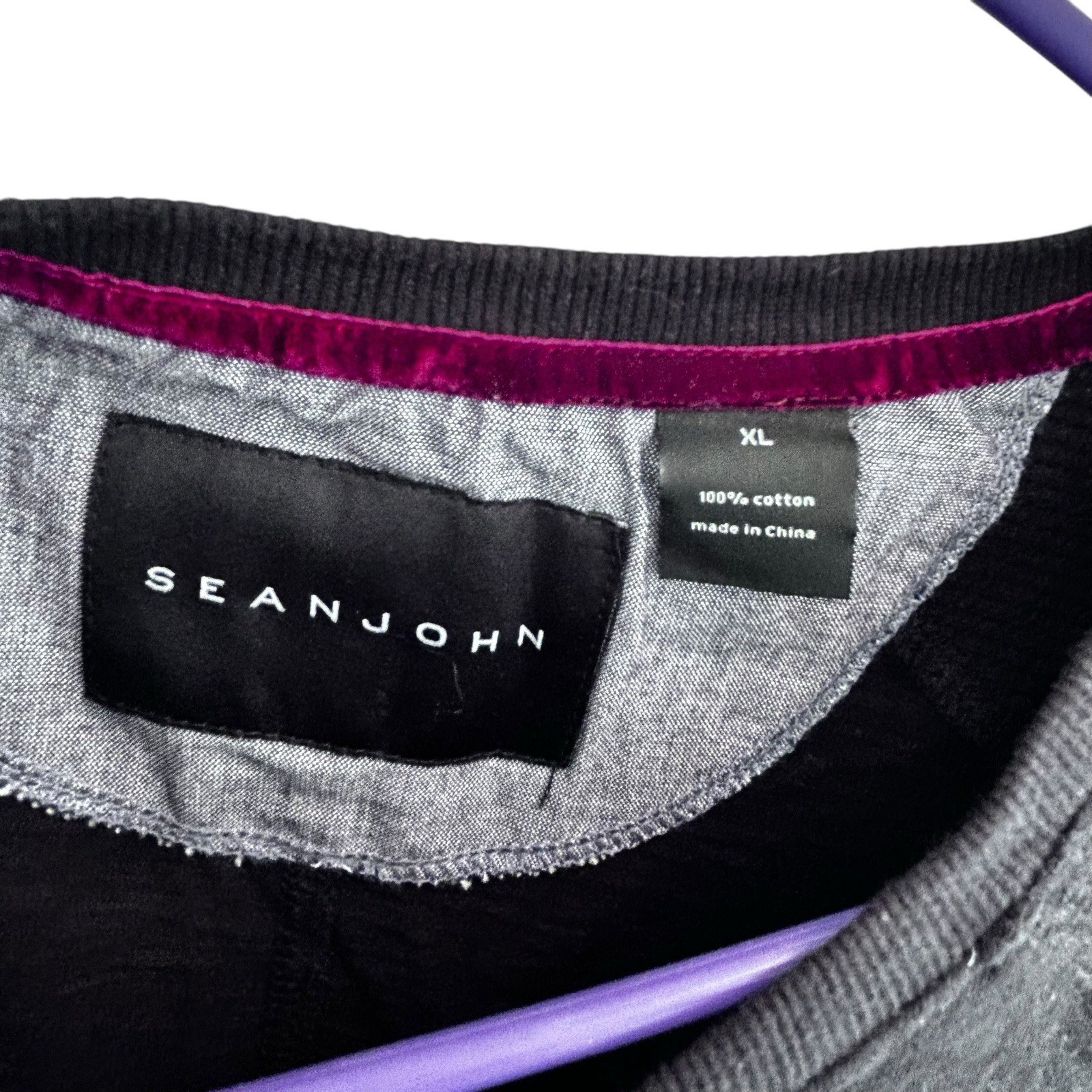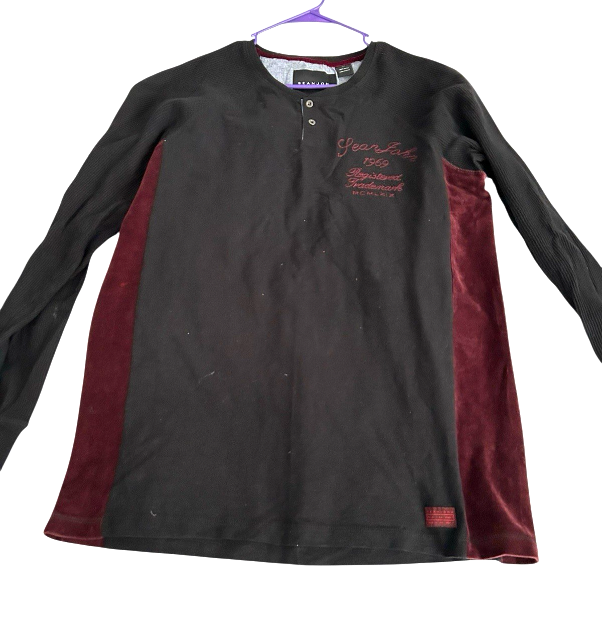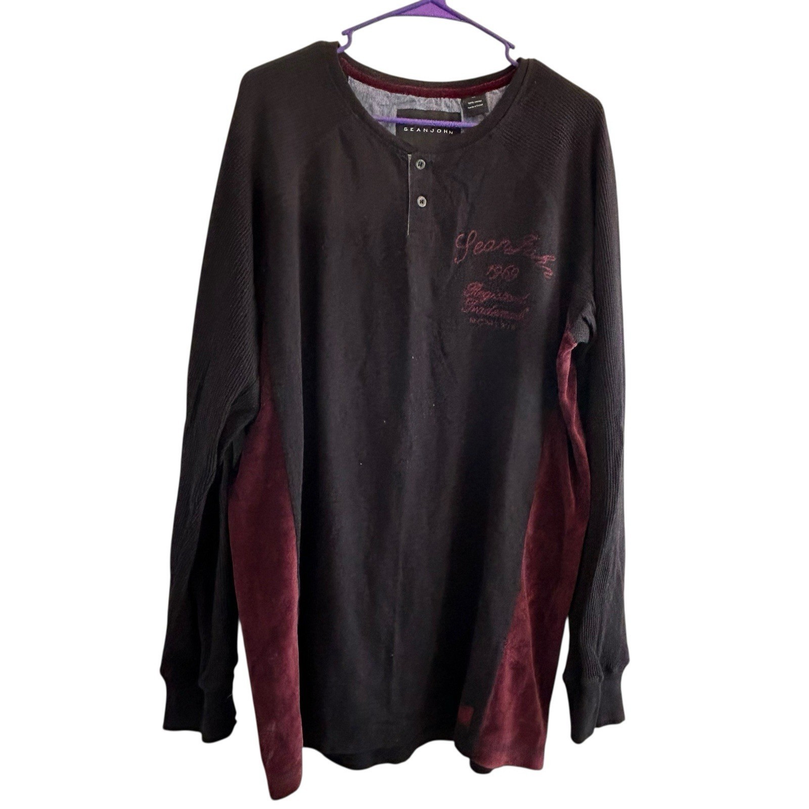 Sean John Henley Long Sleeve Shirt Velour Trim Embroidered XL Black Burgundy Y2K Diddy
