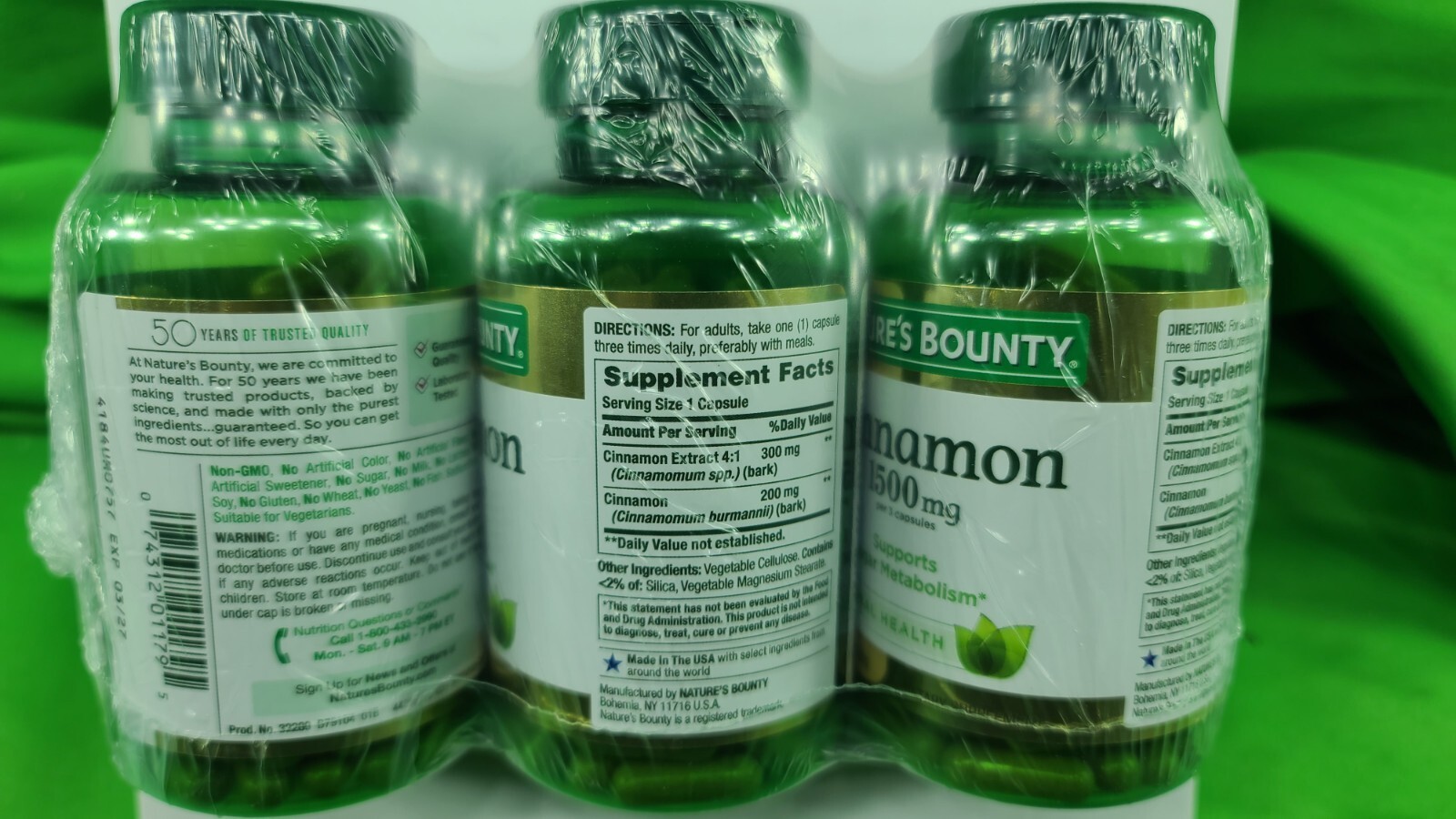 Lot of 3 Nature's Bounty Cinnamon 1500mg Sugar Metabolism 100 Capsules EXP-03/27