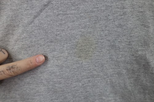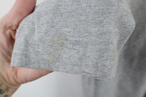 Stains front, right arm. Graphics faded. Color faded