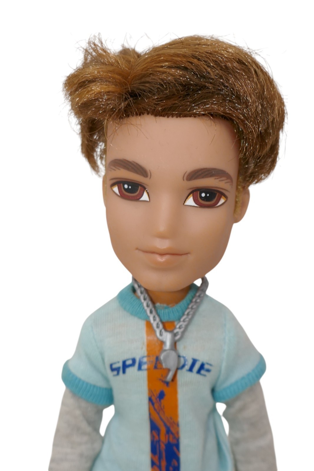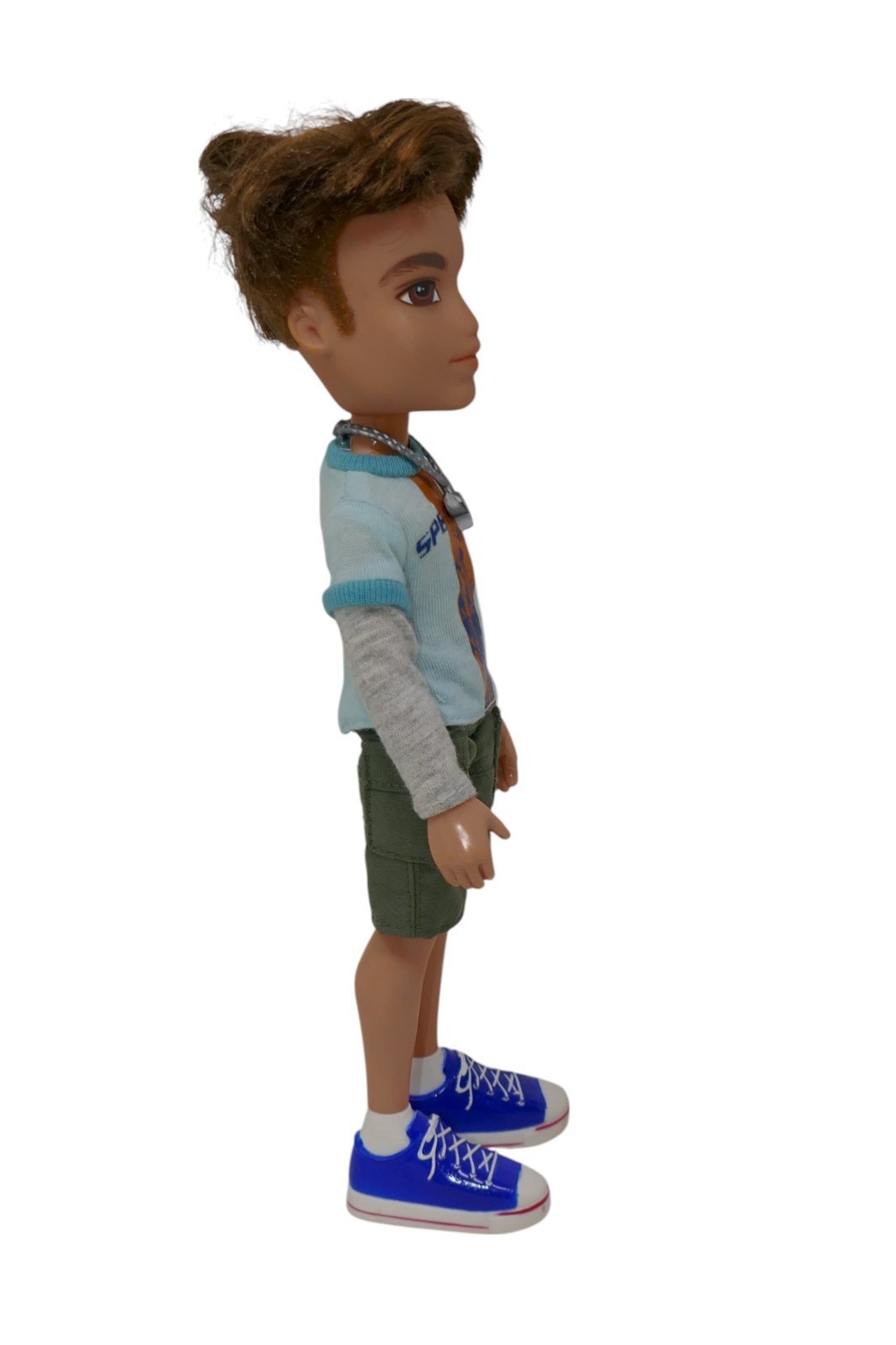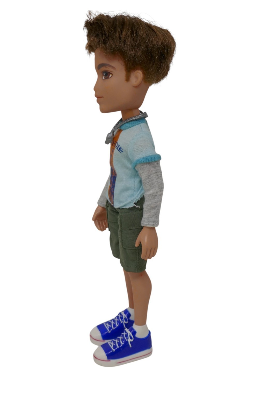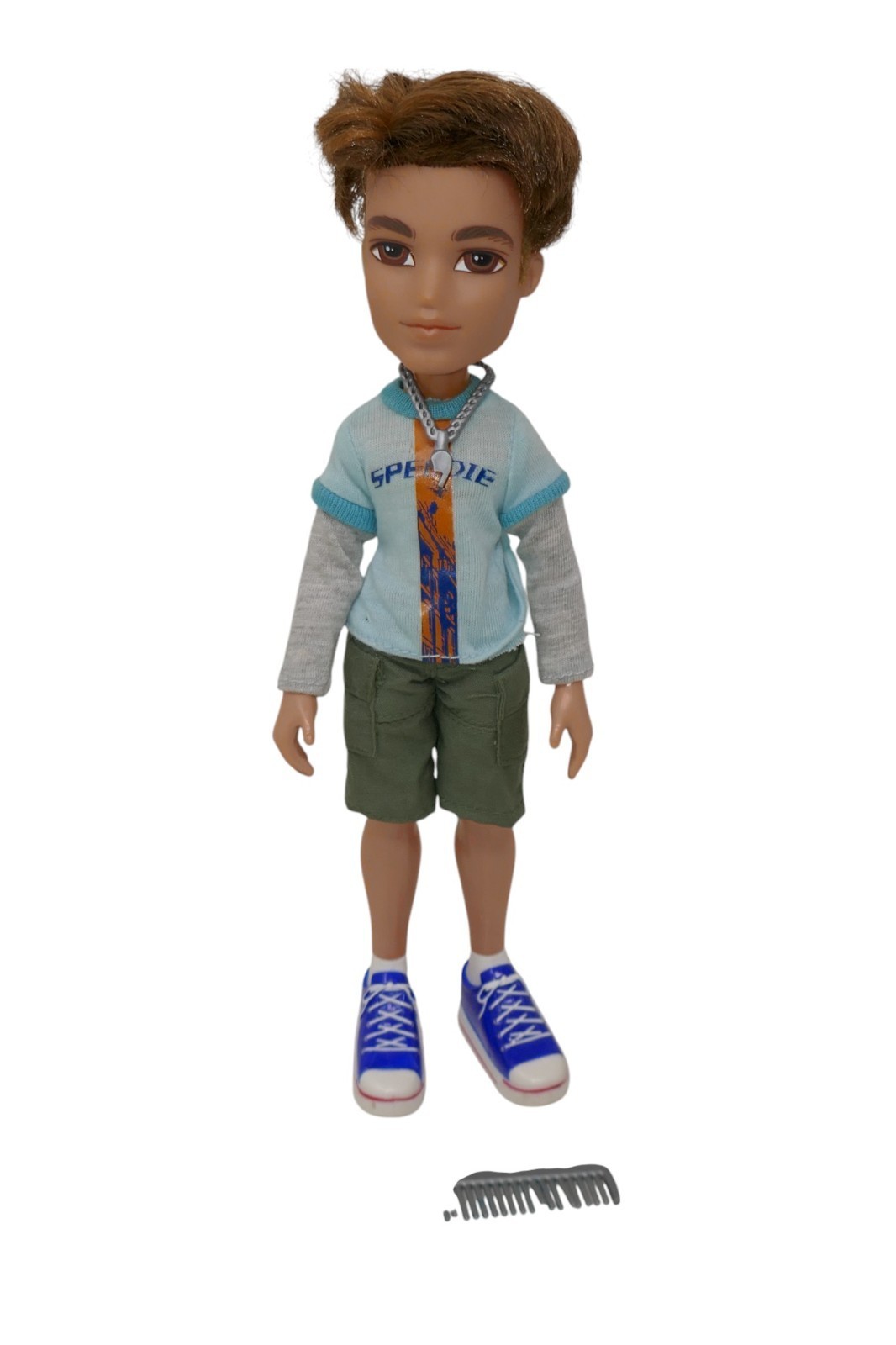 The MGA Bratz Boyz Feelin Cool Doll with Accessories is a 10-inch fashion doll from the Bratz franchise. This boy doll, named Cade, has medium complexion, straight brown hair, and brown eyes. He is not complete and has minimal wear.