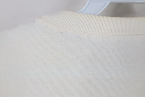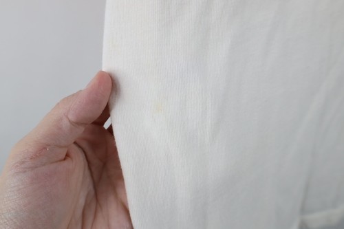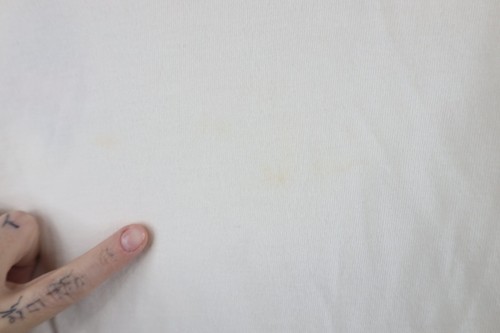 Stains/yellow spots front, back, collar, arms. Collar, armpits discolored. Yellowed. Design distressed. Pilling
