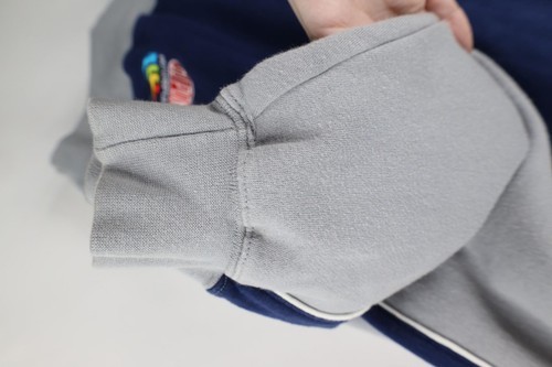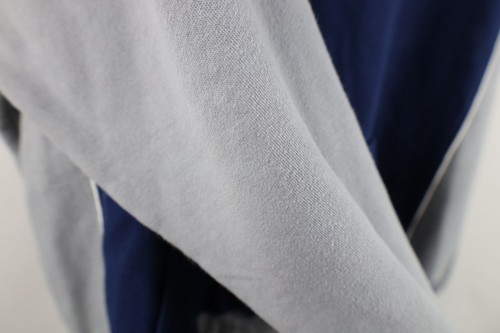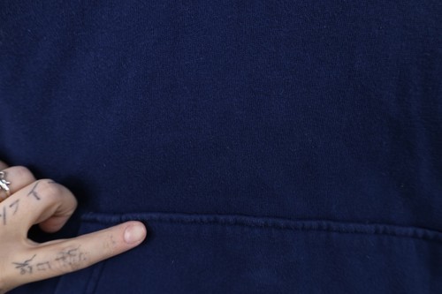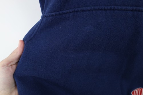 Blemishes front, pocket, arms. Loose threads front, design, cuffs. Design, string distressed. Hood, cuffs discolored. Color faded. Pilling